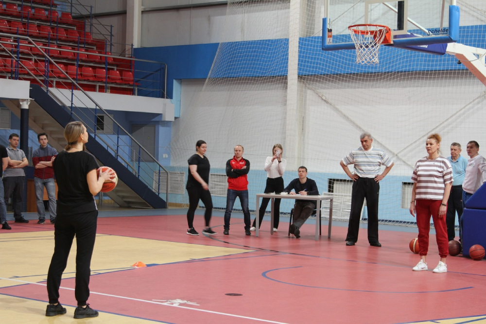 На площадке учебно-спортивного комплекса Светланы Хоркиной команды преподавателей и работников структурных подразделений НИУ «БелГУ» соревновались в бросках мяча в кольцо.