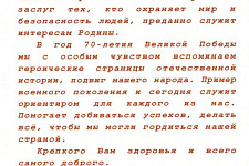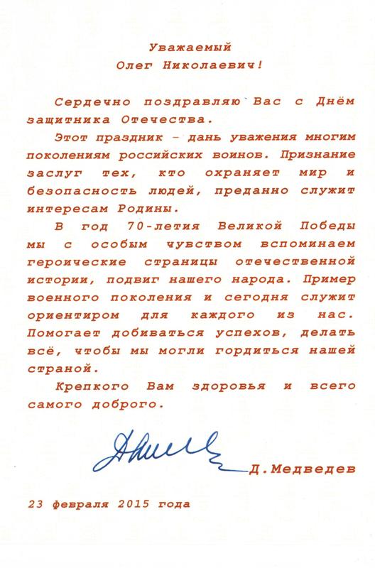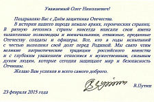 «Сердечно поздравляю Вас с Днём защитника Отечества. Этот праздник - дань уважения многим поколениям российских воинов. Признание заслуг тех, кто охраняет мир и безопасность людей, преданно служит интересам Родины. В год 70-летия Великой Победы мы с особым чувством вспоминаем героические страницы отечественной истории, подвиг нашего народа. Пример военного поколения и сегодня служит ориентиром для каждого из нас. Помогает добиваться успехов, делать всё, чтобы мы могли гордиться нашей страной. Крепкого Вам здоровья и всего самого доброго».