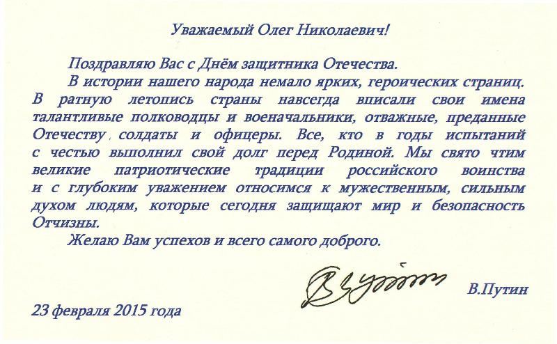 «Поздравляю Вас с Днём защитника Отечества. В истории нашего народа немало ярких, героических страниц. В ратную летопись страны навсегда вписали свои имена талантливые полководцы и военачальники, отважные, преданные Отечеству солдаты и офицеры. Все, кто в годы испытаний с честью выполнил свой долг перед Родиной. Мы свято чтим великие патриотические традиции российского воинства и с глубоким уважением относимся к мужественным, сильным духом людям, которые сегодня защищают мир и безопасность Отчизны. Желаю Вам успехов и всего самого доброго».