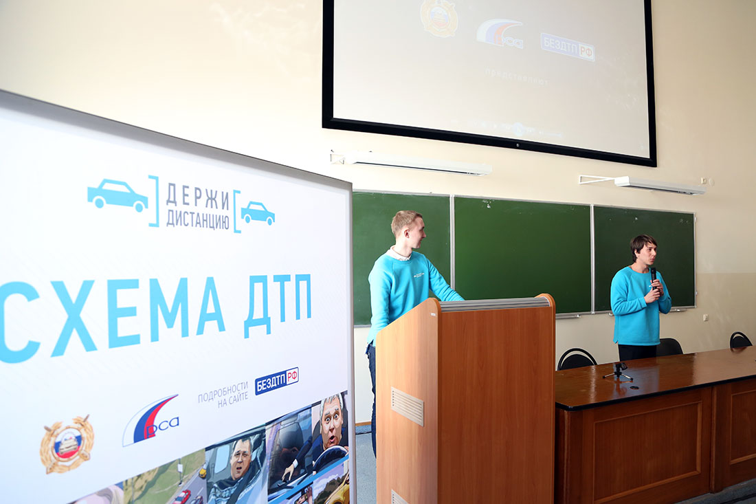 Студентам Белгородского госуниверситета показали образовательный фильм, ТВ-рекламу и продемонстрировали радио-ролики, с целью формирования у молодых людей установки на соблюдение безопасной дистанции при движении на автомобиле.