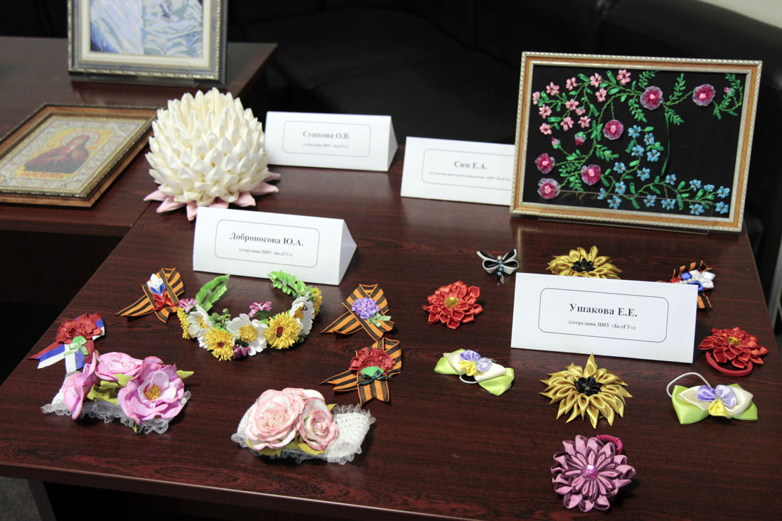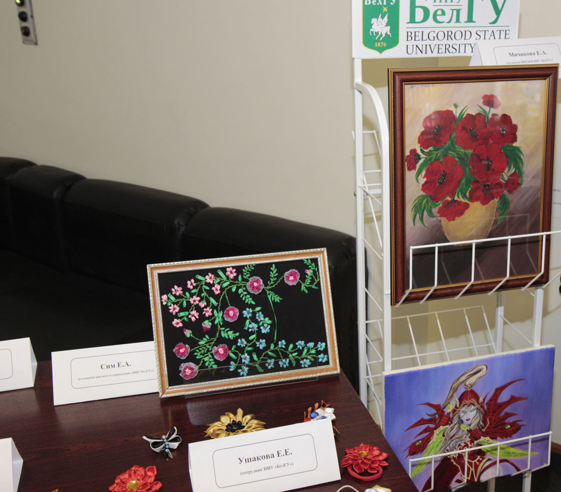 Внимание посетителей привлекают картины, вышитые бисером, крестом (Т. Ястребова, Т. Пышненко, сотрудники университета), лентой (Е. Сим, студентка Института управления); картины «Маки» и «Валира», выполненные маслом на холсте (Е. Мячикова, студентка 3 курса Института инженерных технологий и естественных наук); работы в стиле «силуэт» (О. Анохина, сотрудник университета); изделия из фоамирана (Ю. Доброносова, сотрудник университета); изделия, выполненные в технике «канзаши» - искусство шелкового цветка (Ю. Доброносова, Е.Ушакова); всевозможные украшения для волос (Ю. Доброносова); корзины, сделанные из газет (Е. Микода, сотрудник университета) и др.