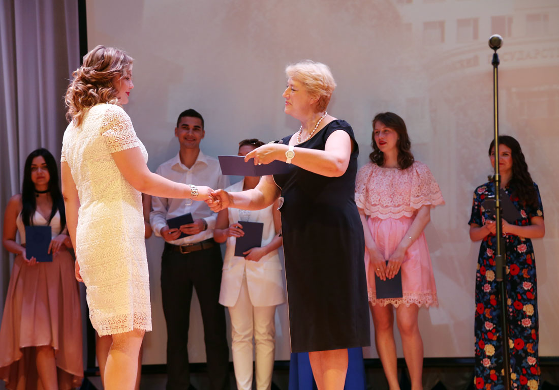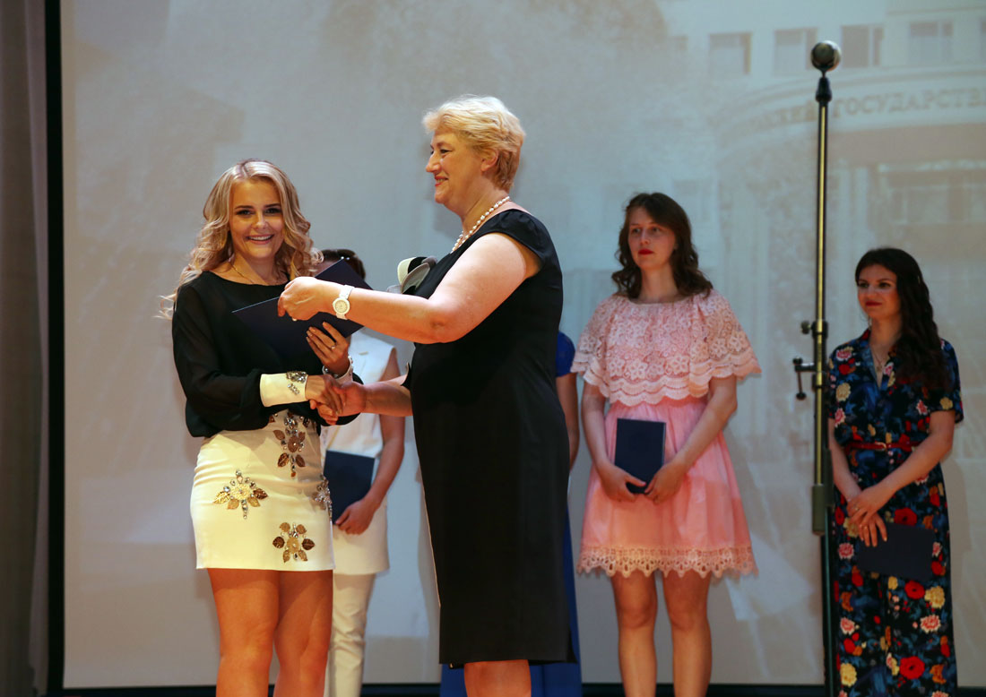 Затем проректор провёл церемонию вручения дипломов. Отметим, что выпускница Марина Лопатина представлена к награждению медалью «Достойному», награде, которую возродил НИУ «БелГУ» в год своего 140-летия.