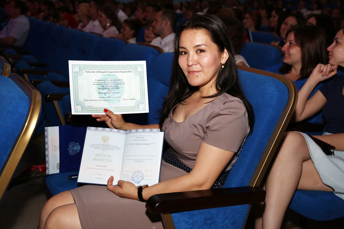 Диплом магистра и сертификат Университета Шанхайской организации сотрудничества вручили Азадахан Наркозиевой, первой выпускнице магистерской программы «Регионы Евразии в контексте мировой политики», реализуемой НИУ «БелГУ» совместно с Киргизским государственным университетом им. Арабаева.