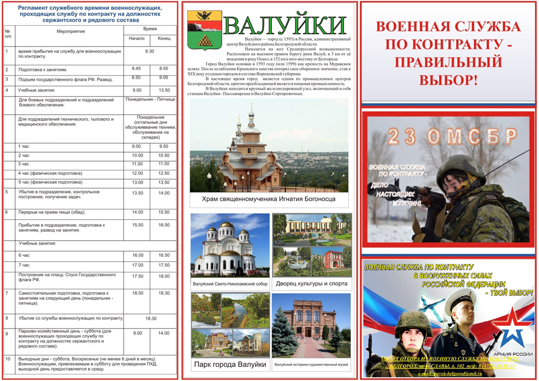 Пункт отбора на военную службу по контракту (2 разряда) по Белгородской области приглашает выпускников учебных заведений высшего профессионального образования 2016 года на беседу для прохождения военной службы по контракту в воинских частях Белгородского гарнизона. Адрес: г. Белгород, пр-т Славы, 102. тел/факс: 8(4722) 32-88-53, 32-86-93; e-mail: povsk-belgorod@mil.ru