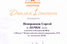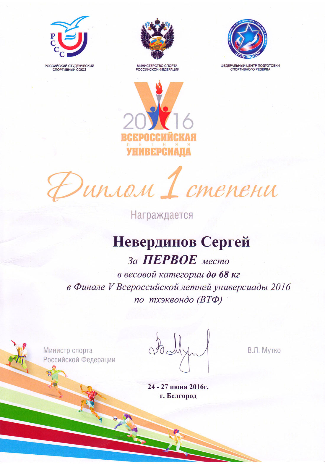 Мастер спорта России Сергей Невердинов стал золотым призёром универсиады в Олимпийском виде единоборств – тхэквондо. На пути к высшей ступени пьедестала в своей весовой категории до 68 кг он одолел троих оппонентов. Первый бой Сергей выиграл досрочно, второй – решением судей, а на финальный поединок соперник отказался выйти.