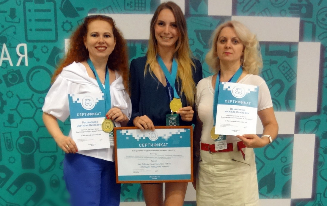 Анастасия Череп и Александр Авдеев на школе Фонда работали над социально значимыми проектами. Пятьдесят пять команд трудились над своими идеями под руководством опытных менторов. Проект Анастасии «Мелодии победного вальса» дошёл до финального отбора и получил поддержку Фонда в числе восьми проектов.