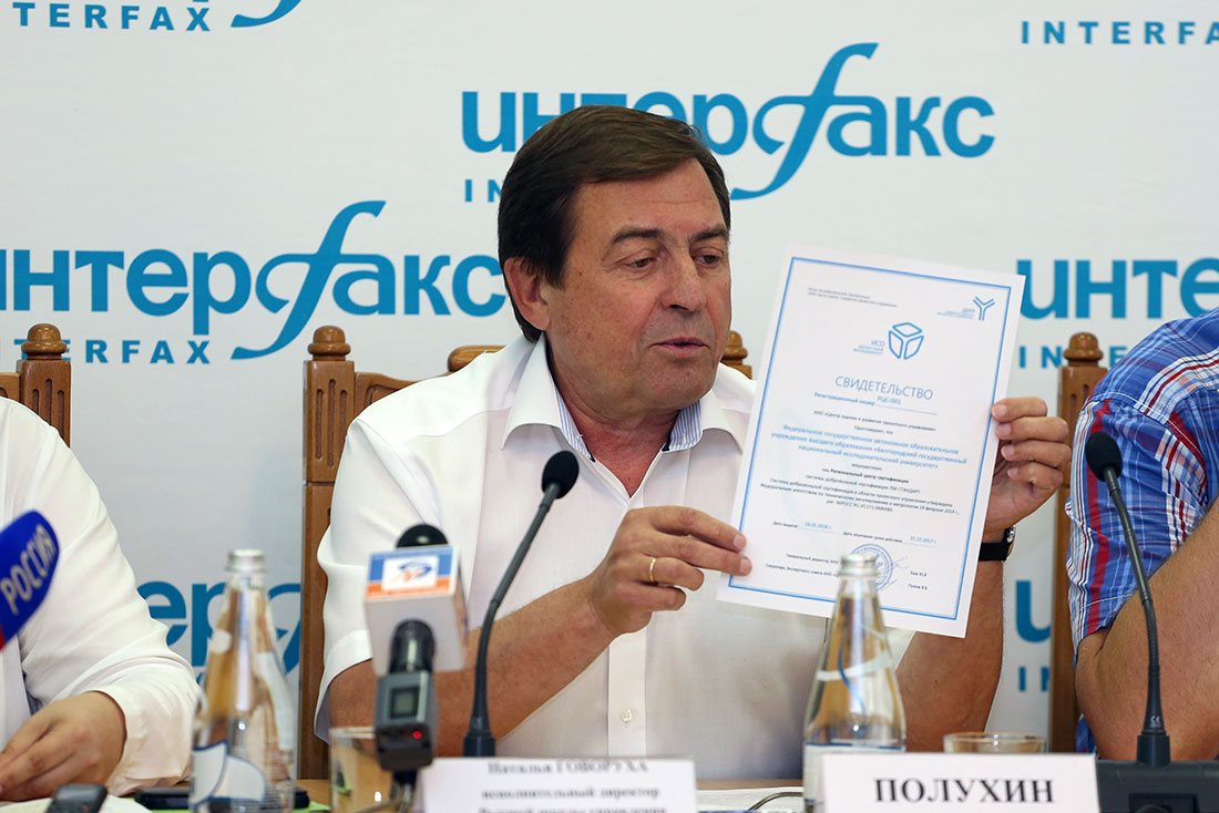 Пресс-конференция прошла в пресс-центре регионального отделения «Интерфакса». В своём вступительном слове ректор НИУ «БелГУ» Олег Полухин отметил, что университет готовится к празднованию в сентябре знаменательной даты – 140-летия со дня основания и каждое новое достижение в преддверии этой даты – это подарок вузу к юбилею. А получение свидетельства об аккредитации Белгородского госуниверситета как Регионального центра сертификации проектных менеджеров является большим успехом. Свидетельство под номером 001, то есть первое в Центральном федеральном округе, выдано АНО «Центр оценки и развития проектного управления» для организации добровольной сертификации ПМ СТАНДАРТ.