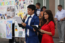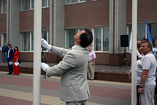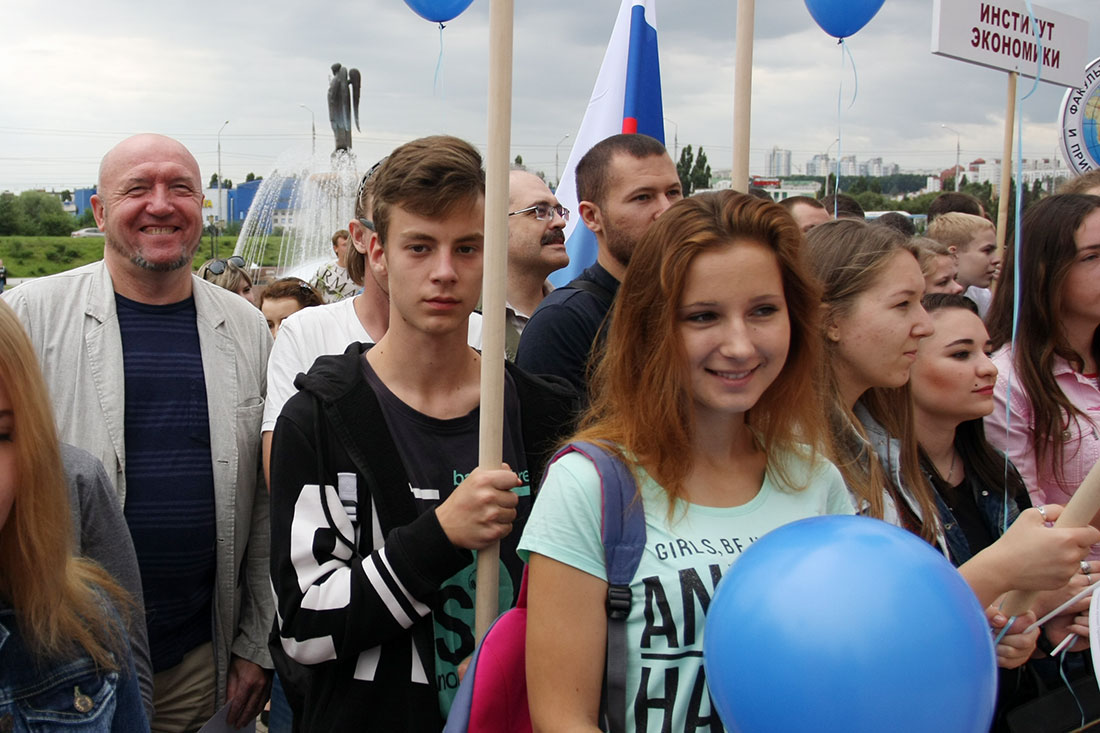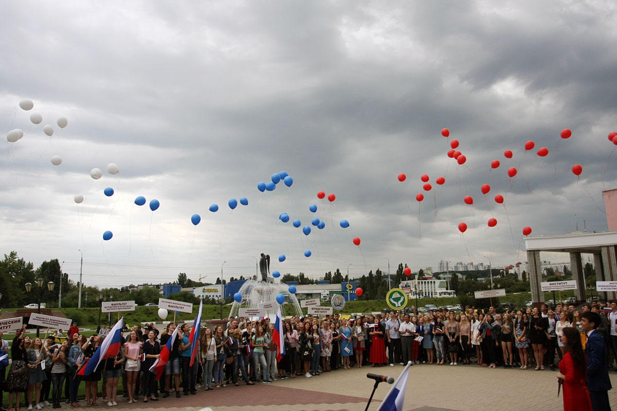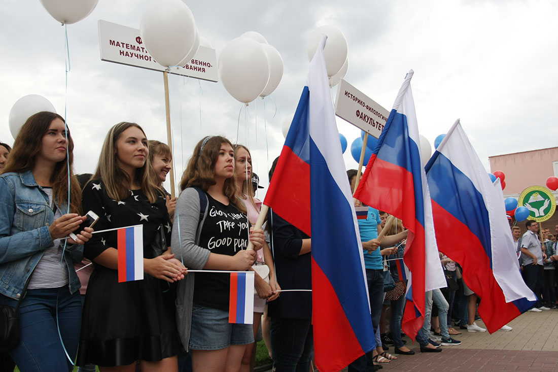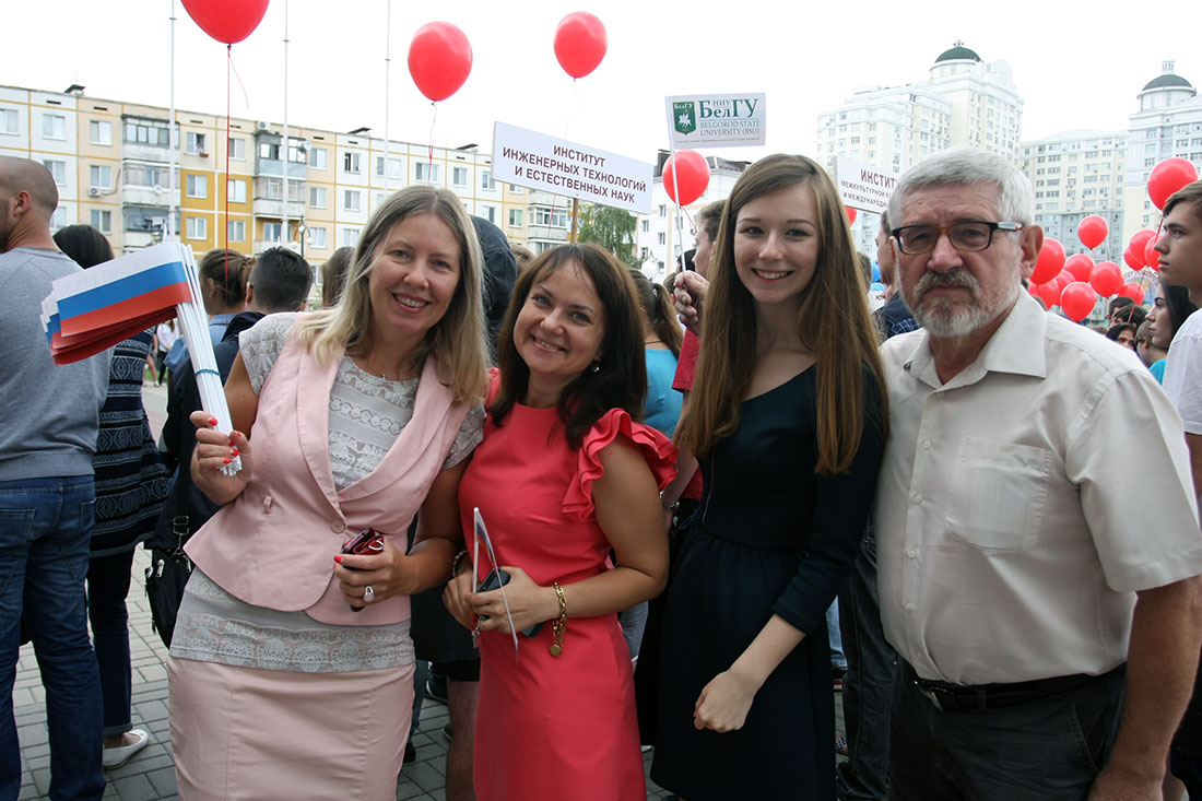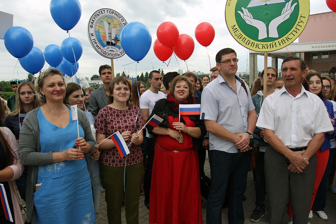 Для торжественного поднятия Государственного флага Российской Федерации был приглашен проректор по учебной работе и информатизации Александр Маматов. Флаг Белгородской области было поручено поднять Инне Диденко. А Флаг НИУ «БелГУ» поднял студент 1-го курса Института экономики Илья Сорокин. Под гимн Российской Федерации три флага взмыли в небо.