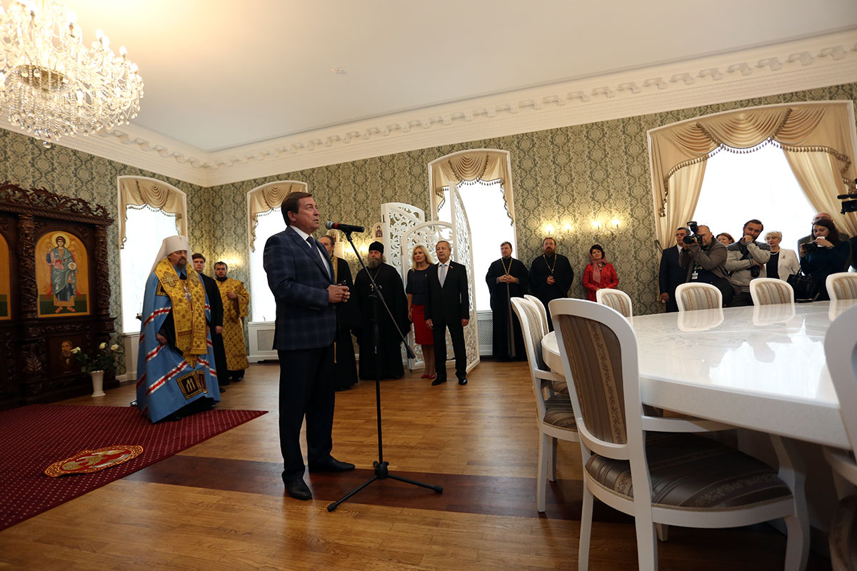 Выступая на церемонии, ректор Олег Полухин напомнил присутствующим, что 130 лет назад, в 1886 году, в этом зале состоялось освящение престола домового храма во имя святой преподобномученицы Евгении Римской. На протяжении более тридцати лет – вплоть до запрета, последовавшего за революционными событиями 1917 года, – здесь совершались божественные литургии и православные церковные таинства. Среди молитвенников гимназического храма были учёные, инженеры, писатели, церковные подвижники и новомученики ХХ столетия. А затем, почти сто лет, храм находился в забвении: здесь размещались административные и хозяйственные службы, учебные аудитории. В 2009 году в здании социально-теологического факультета была открыта библиотека-музей русского мыслителя, выходца из семьи белгородских священнослужителей Николая Николаевича Страхова.