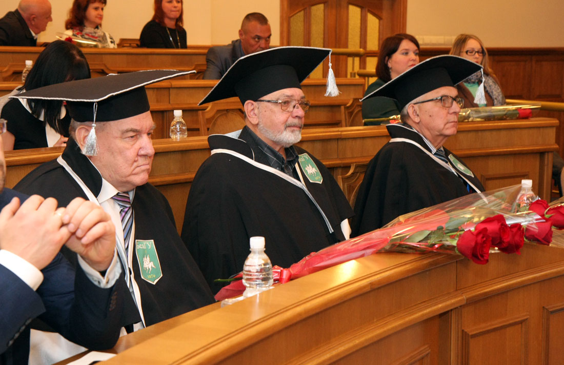 Ректор НИУ «БелГУ», профессор Олег Полухин вручил аттестаты «Почетный профессор НИУ «БелГУ» профессору кафедры всеобщей истории и зарубежного регионоведения Евгению Дворецкому, завкафедрой информационно-телекоммуникационных систем и технологий, профессору Евгению Жилякову и завкафедрой пропедевтики внутренних болезней, профессору Феликсу Пятаковичу.