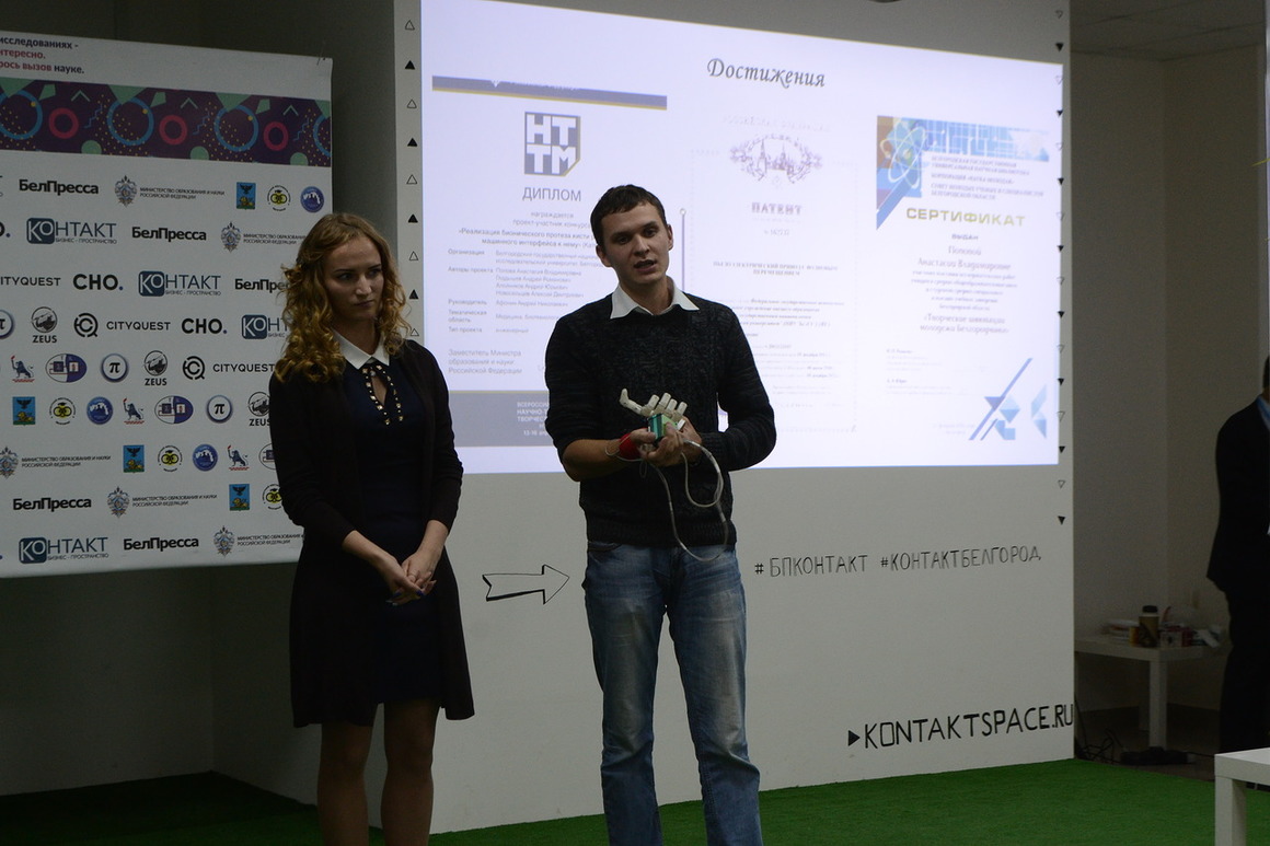 1 место завоевала команда студентов ИИТиЕН НИУ «БелГУ» (Анастасия Попова и Андрей Гладышев). Победители представили «Разработку и реализацию макета бионического протеза кисти руки, человеко-машинного интерфейса и системы управления»;