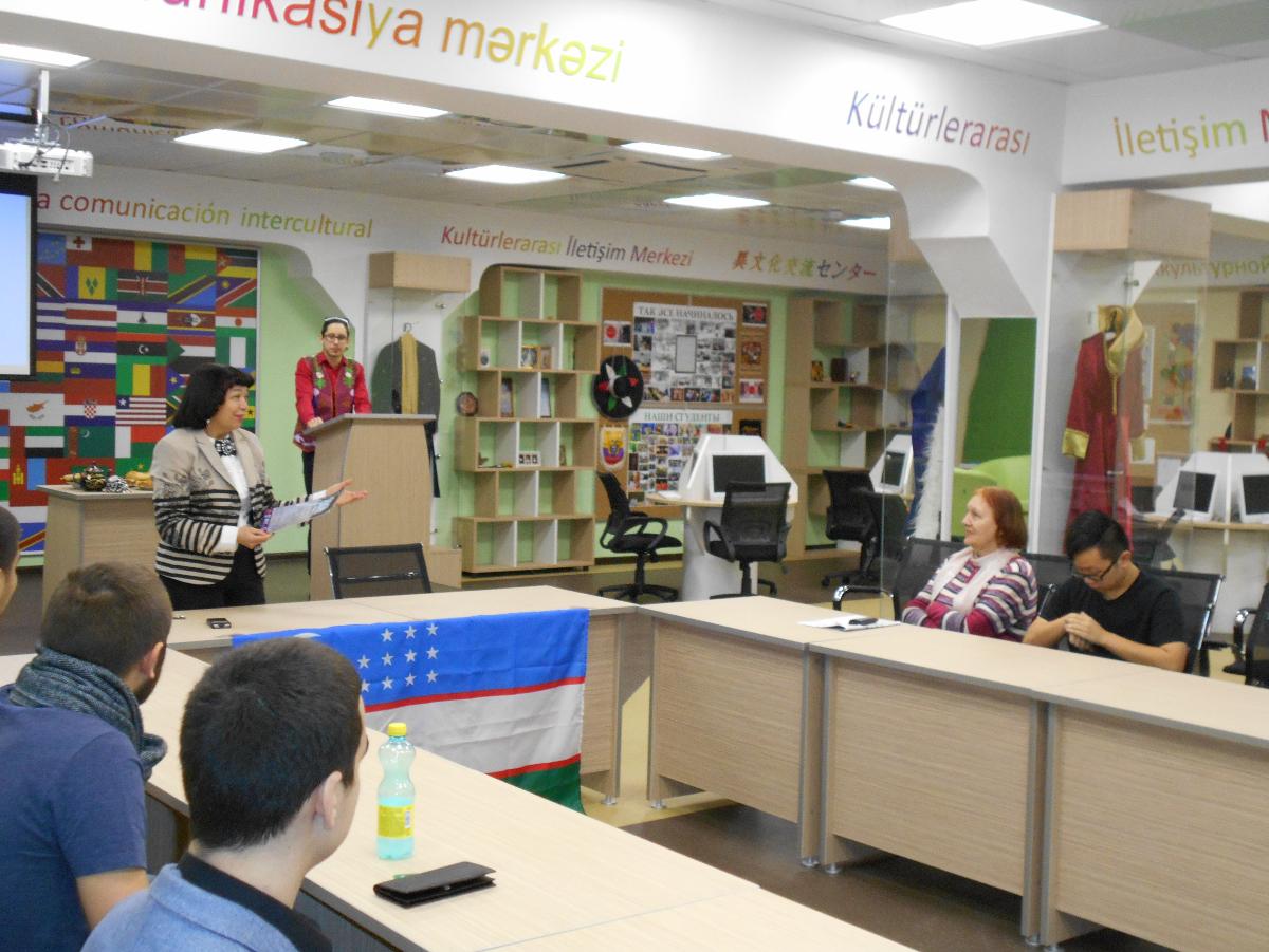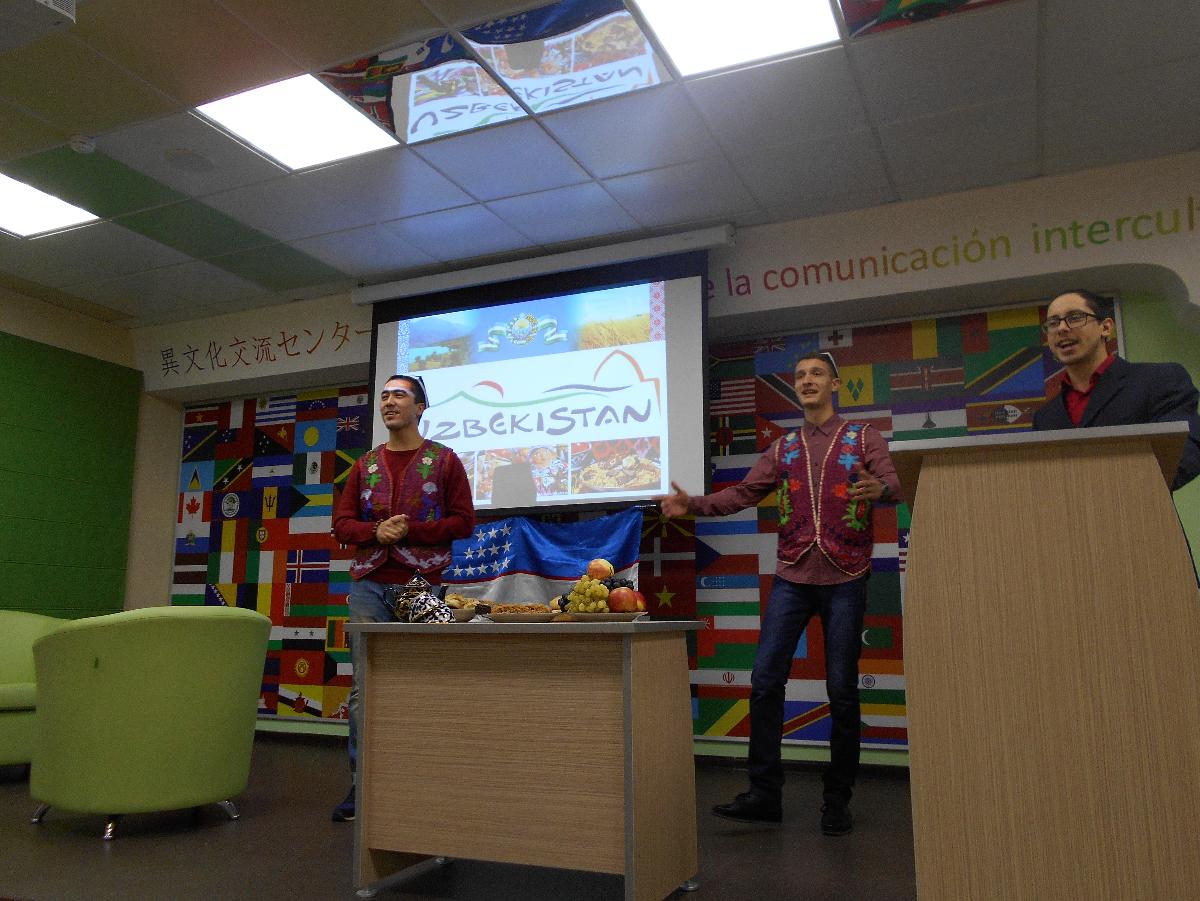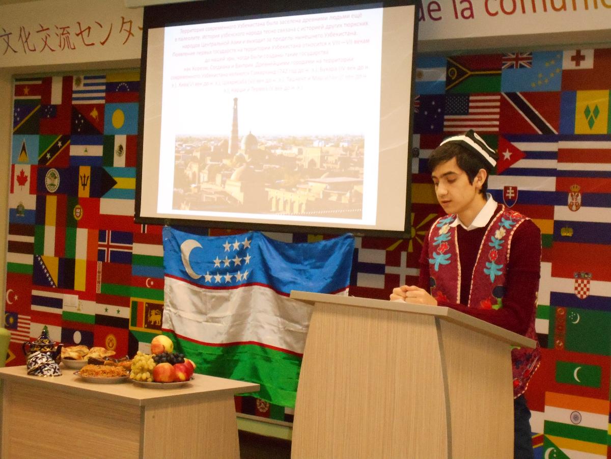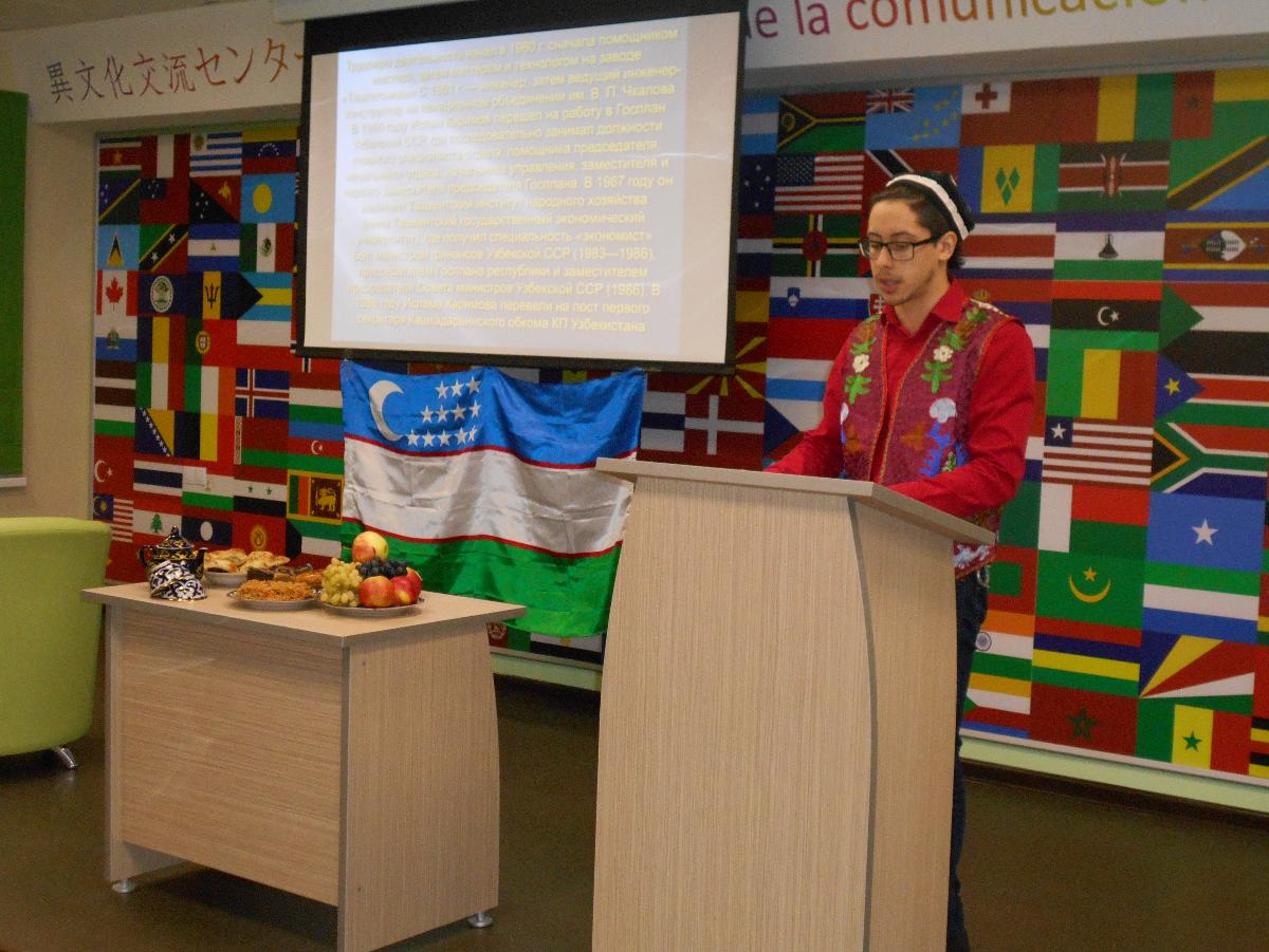 Узбекское землячество образовалось в октябре этого года и уже активно включилось в университетскую жизнь. Студенты отнеслись очень ответственно и серьёзно к своему первому мероприятию, интересно и увлекательно рассказали о своей стране, о её истории, культуре, традициях, а также познакомили присутствующих с узбекской кухней.