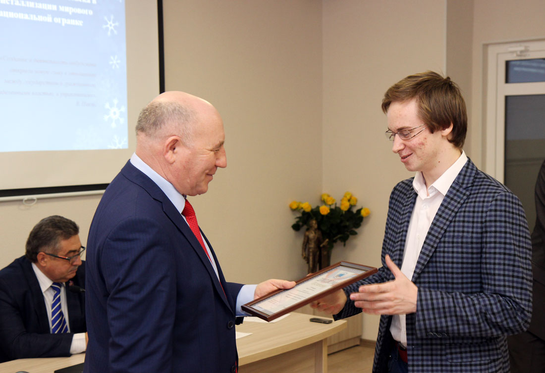 Третье место поделили между собой аспирант кафедры административного и международного права Валерия Гелуненко (тема «Самозащитные аспекты свободы слова»), студентка Екатерина Морозова (тема «Актуальные проблемы обеспечения информационной безопасности детей в сети «Интернет») и студент 2 курса Олег Скопенко (тема «Проблема нарушения права на защиту подозреваемого (обвиняемого) на стадии предварительного расследования»).