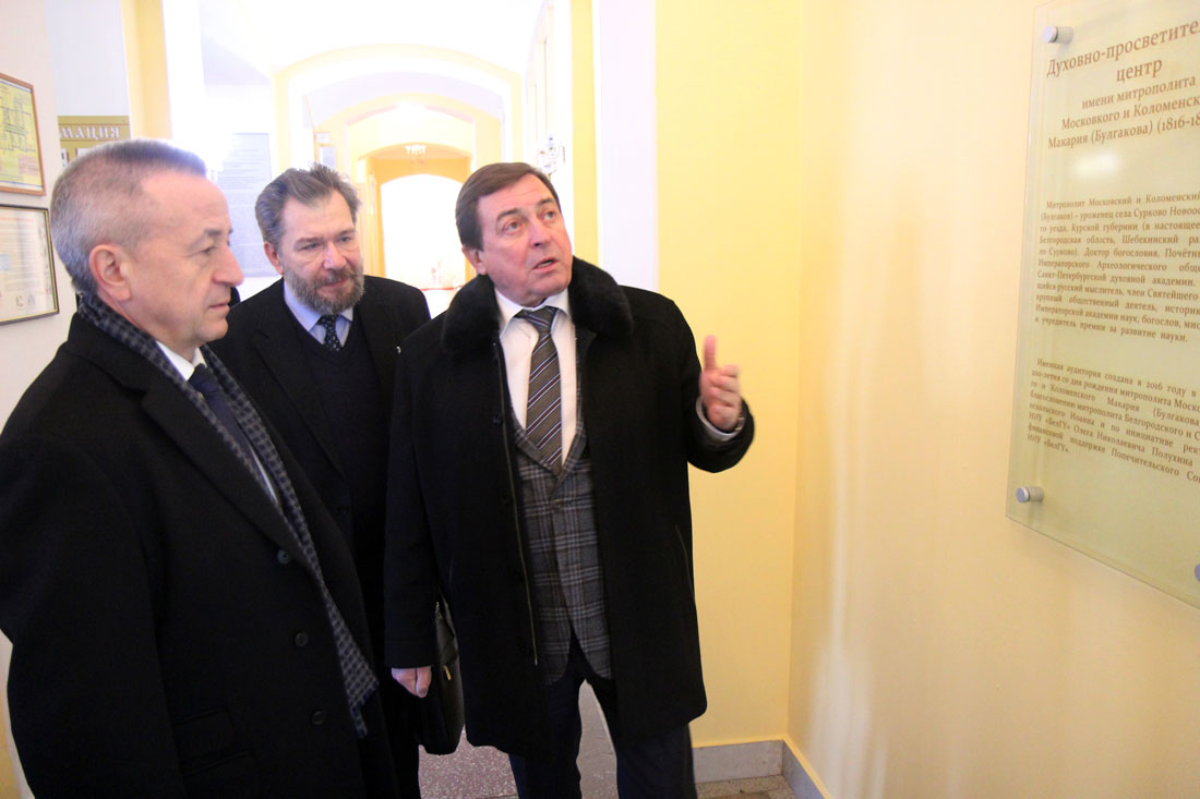 Отметим, что во время посещения социально-теологического факультета университета, помимо осмотра открывшихся здесь духовно-просветительского центра митрополита Московского и Коломенского Макария (Булгакова) и храма-часовни святой преподобномученицы Евгении Римской, ректор рассказал председателю Белгородской областной думы о ходе реализации проекта по созданию библиотеки-музея земляка, русского философа и литературного критика Николая Страхова. Этот проект планируется в основном завершить в первом полугодии 2017 года.