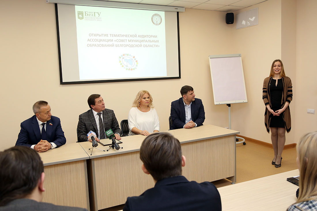 В НИУ «БелГУ» в торжественной обстановке была открыта новая тематическая аудитория, посвящённая Совету муниципальных образований Белгородской области. В мероприятии приняли участие председатель Белгородской областной думы и председатель Ассоциации «Совет муниципальных образований Белгородской области» Василий Потрясаев, исполнительный директор Ассоциации Татьяна Бочарова, ректор университета профессор Олег Полухин, директор Института управления НИУ «БелГУ» Виктор Захаров, студенты и преподаватели института.