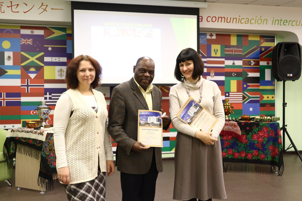 Затем наступил самый торжественный и долгожданный момент – вручение почетных грамот и призов. Выставка «Этнокультура народов мира», организованная Научной библиотекой им. Н.Н. Страхова, Центром межкультурной коммуникации и Институтом межкультурной коммуникации и международных отношений демонстрировалась целый месяц, в течение которого продолжалось он-лайн голосование на официальной странице Центра межкультурной коммуникации «Вконтакте», в котором приняло участие почти 1, 5 тысячи человек.