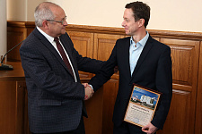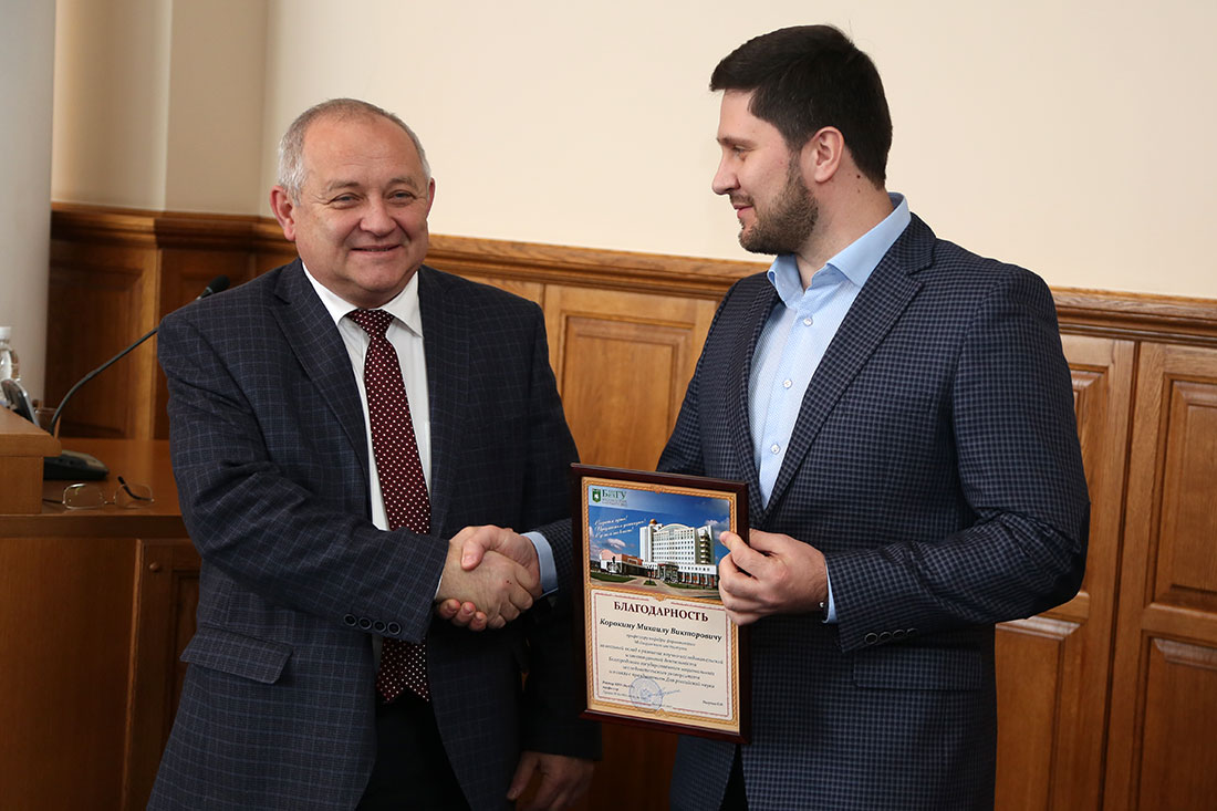 Проректор вручил благодарности НИУ «БелГУ» молодым ученым университета: зав. лабораторией биоматериалов научно-образовательного и инновационного центра «Наноструктурные материалы и нанотехнологии», доктору физико-математических наук Максиму Иванову, профессору кафедры фармакологии Медицинского института, доктору фармацевтических наук Михаилу Корокину.