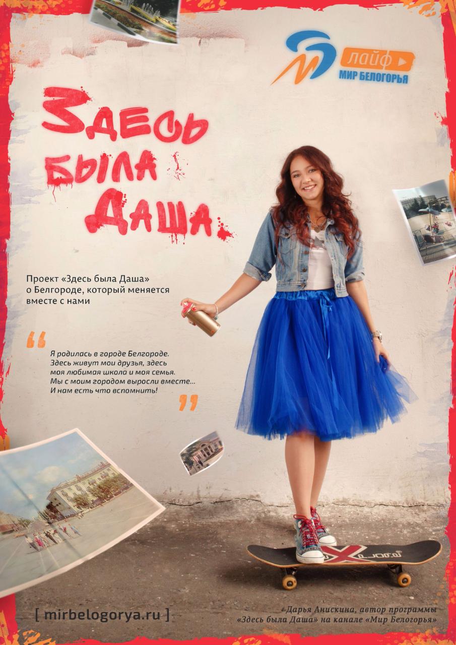 На конкурс Дарья Анискина представила один из выпусков своего проекта «Здесь была Даша», над которым девушка работает в молодёжной студии ТРК «Мир Белогорья». Идея проекта – рассказать об интересных и важных местах Белгорода. Конкурсная работа Дарьи «Кинотеатр «Победа» была отобрана в финал в номинации «Репортёр».