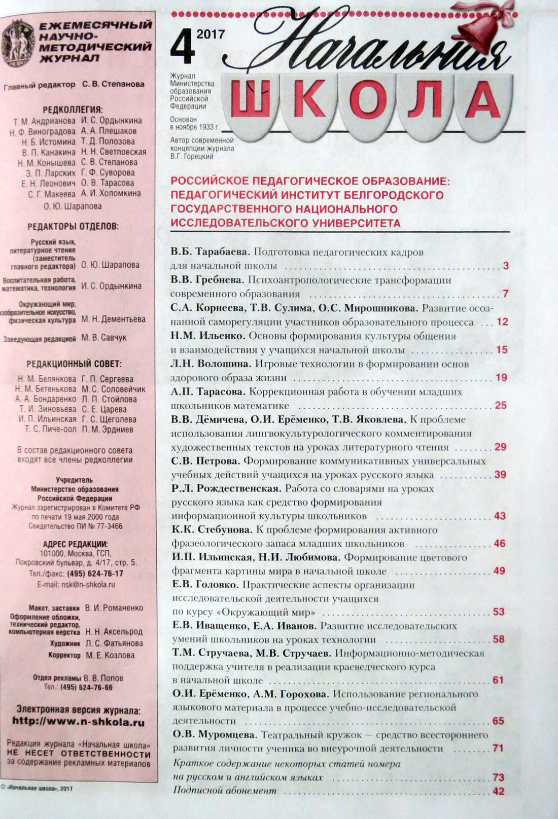 На страницах авторитетного издания «Начальная школа» были опубликованы материалы преподавателей НИУ «БелГУ», посвящённые проблемам подготовки специалистов в области начального образования в университете.