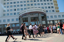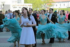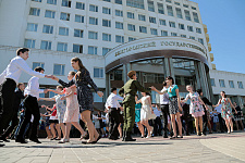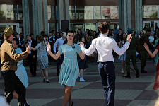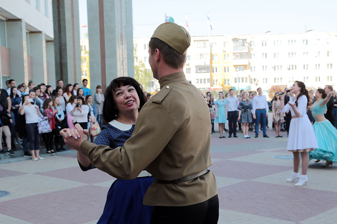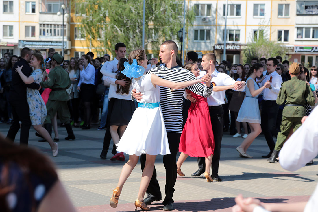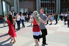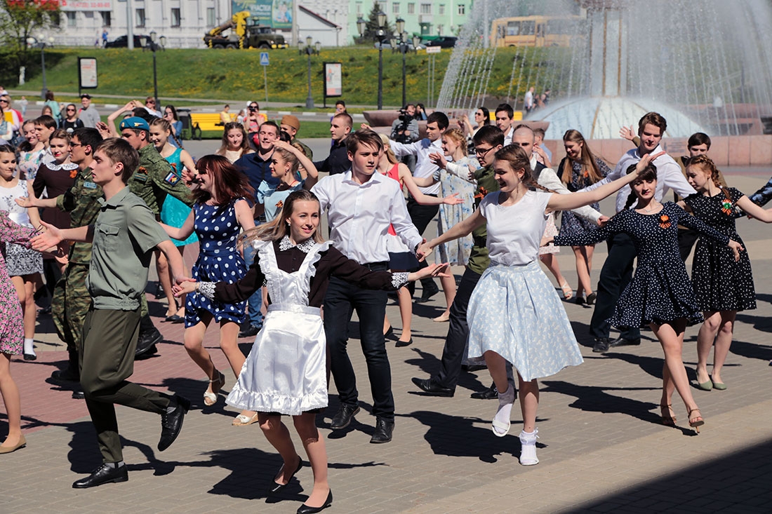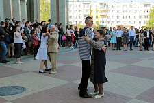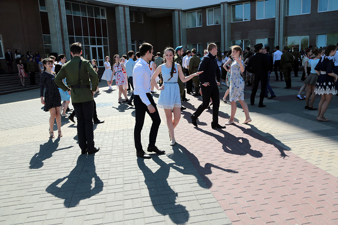 Прозвучал марш «Тоска по Родине» в исполнении ректорского духового оркестра. Затем на площадь перед университетом вышли более 40 пар танцующих.