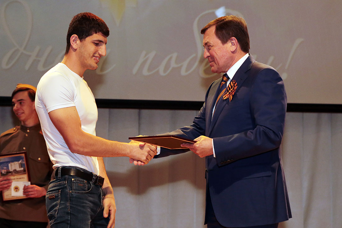 В канун дня Великой Победы на праздничных мероприятиях ректор вуза поздравил ветеранов, вручил золотые значки студентам за высокие показатели в комплексе ГТО