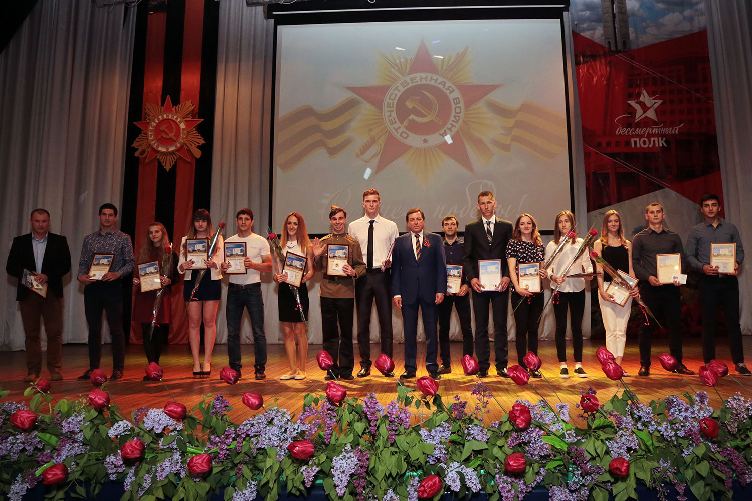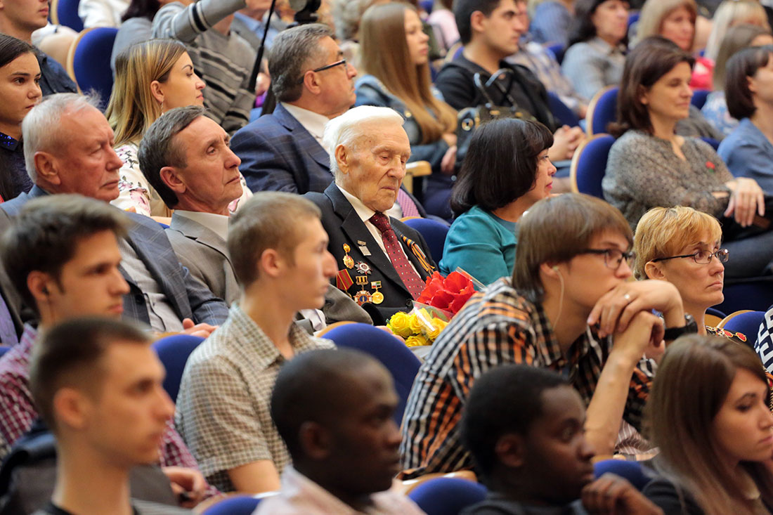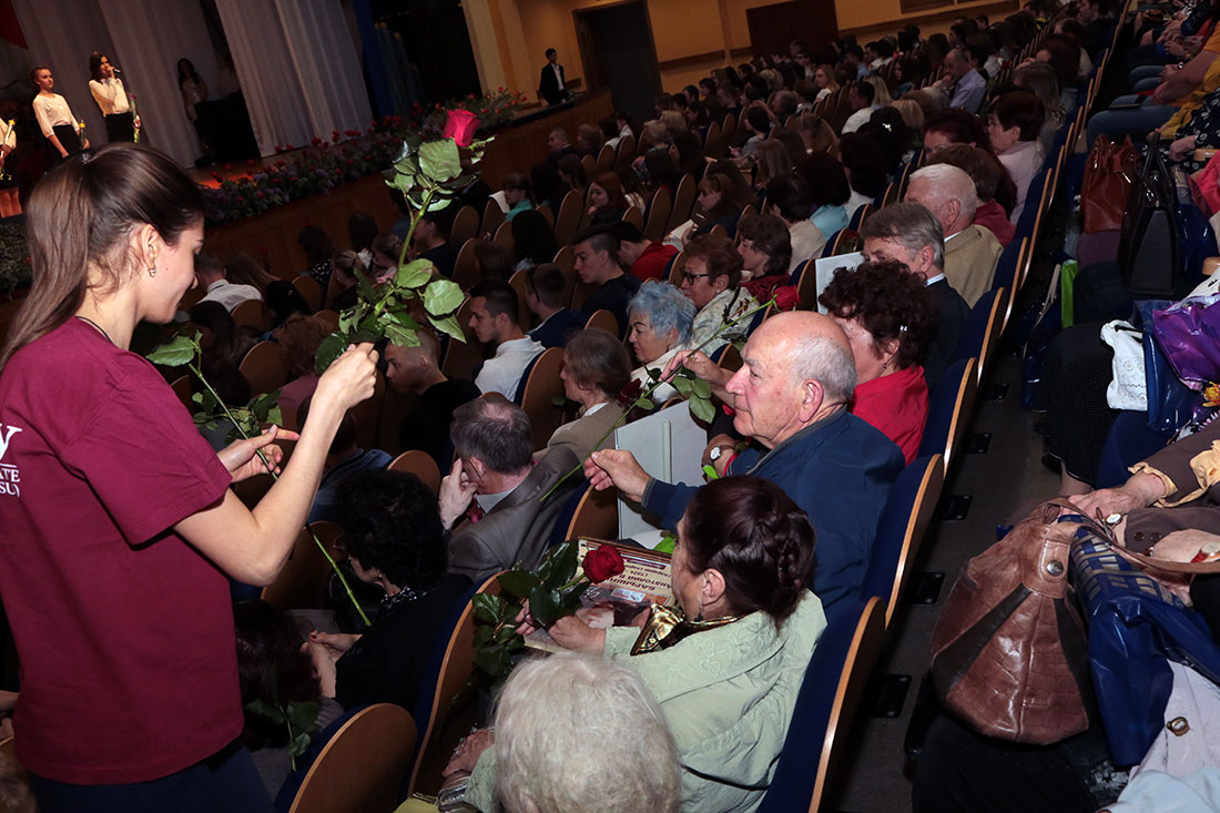 Главными зрителями на празднике в молодежном культурном центре вуза стали представители Совета ветеранов НИУ «БелГУ»: участники Великой Отечественной войны, которых осталось всего 7 человек, дети войны, ветераны труда, пенсионеры. Студенты подарили ветеранам цветы.