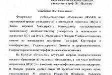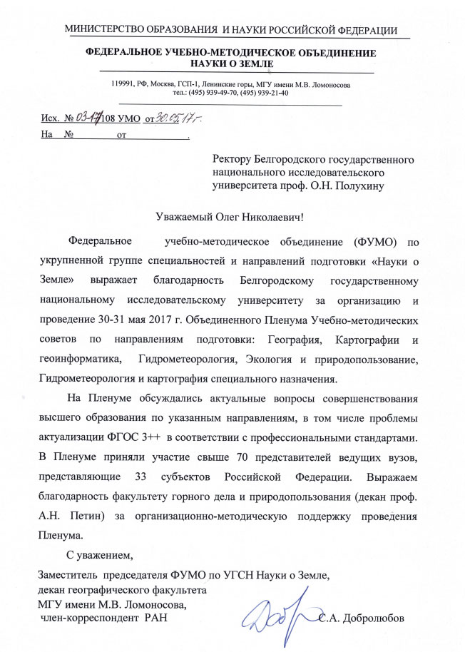 На имя ректора НИУ «БелГУ» профессора Олега Полухина пришло благодарственное письмо. Заместитель председателя ФУМО по УГСН "Науки о Земле", декан географического факультета МГУ им. М.В. Ломоносова, член-корреспондент РАН Сергей Добролюбов поблагодарил руководство вуза за организацию и проведение 30-31 мая 2017 года Объединенного Пленума УМС по направлениям подготовки: "География", "Картография и геоинформатика", "Гидрометеорология", "Экология и природопользование", "Гидрометеорология и картография специального назначения".