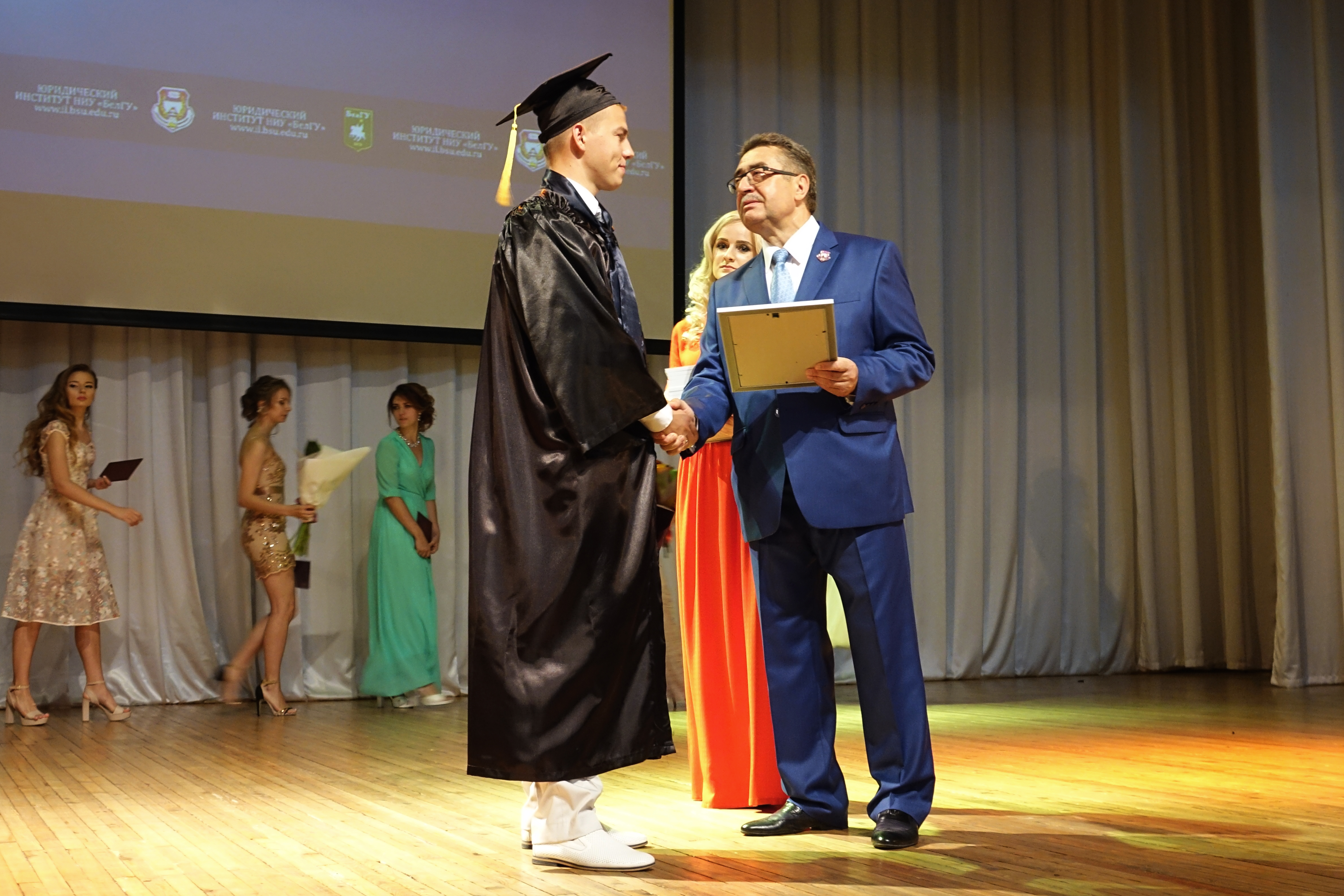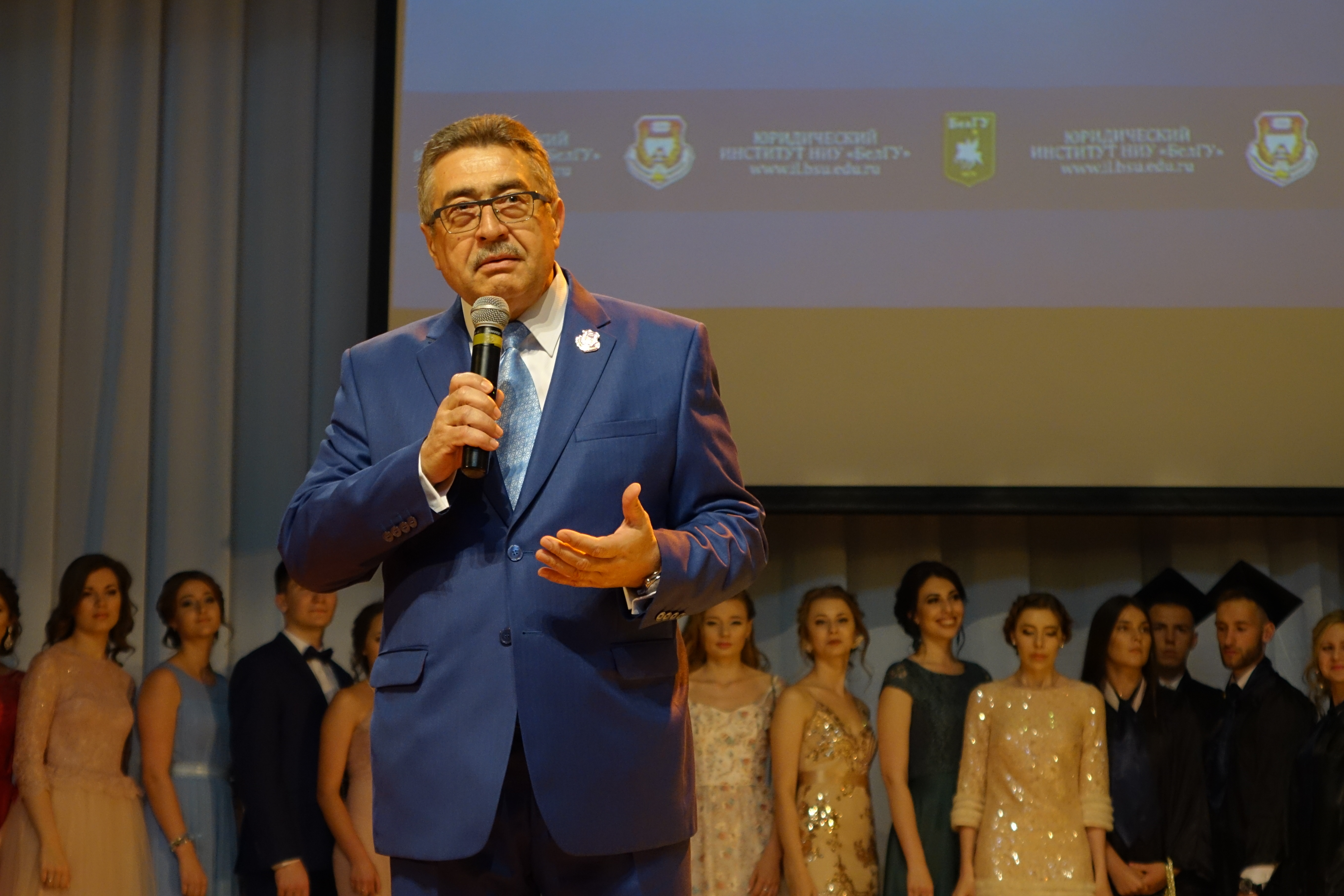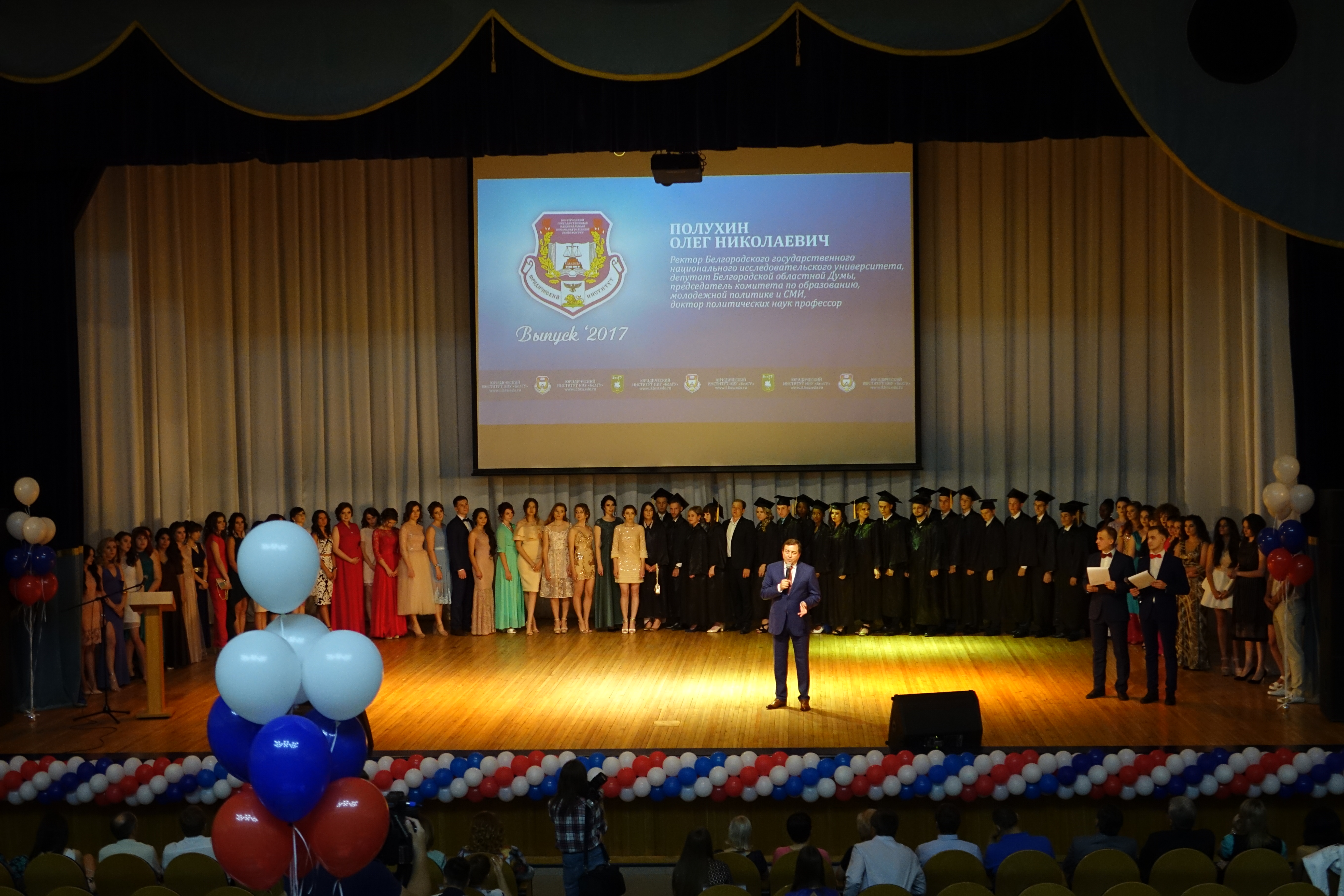 Поздравляли будущих юристов в этот день те, кто уже является примером для подражания – будущие работодатели новых выпускников, многие из которых сами оканчивали НИУ «БелГУ». С приветственными словами к выпускникам обратились начальник управления судебного департамента в Белгородской области Сергей Захаров, секретарь Совета безопасности Белгородской области Олег Мантулин, руководитель Следственного управления Следственного комитета Российской Федерации по Белгородской области Александр Сергеев, председатель Арбитражного суда Белгородской области Андрей Шеин, заместитель прокурора Белгородской области Эдуард Логвинов, вице-президент Адвокатской палаты Белгородской области Михаил Бажинов, начальник УМВД России по г. Белгороду Евгений Гаенко.
