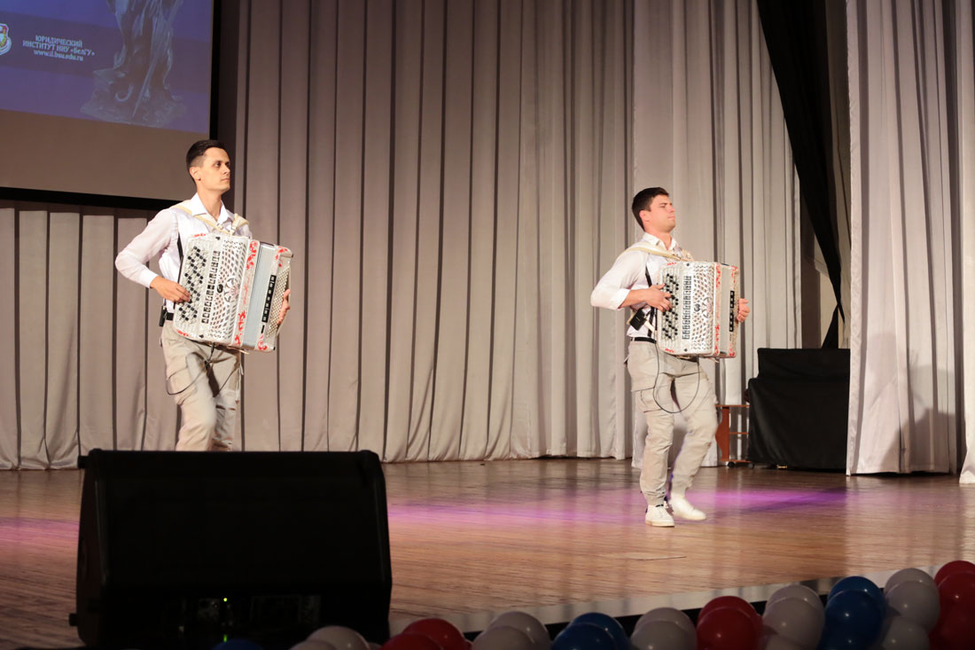 С творческими подарками для выпускников института выступили директор Центра медиации НИУ «БелГУ» Марина Сороколетова и мастер спорта международного класса по кикбоксингу, лучшая спортсменка НИУ «БелГУ» 2016 года, студентка 2 курса Юридического института Анна Самыгина. Выпускники института, участники творческих коллективов НИУ «БелГУ» Игорь Попов, Карина Белкина, Вадим Низиев порадовали собравшихся музыкальными номерами.