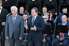 Торжественная часть началась с выступления солистов Белгородской филармонии, лауреатов международных конкурсов Оксаны Меньшиковой, Евгения Доброва, Ивана Белыш, камерного хора под руководством Елены Алексеевой и концертного оркестра духовых инструментов под управлением Юрия Меркулова. Коллектив исполнил песню: «Навсегда великая страна».