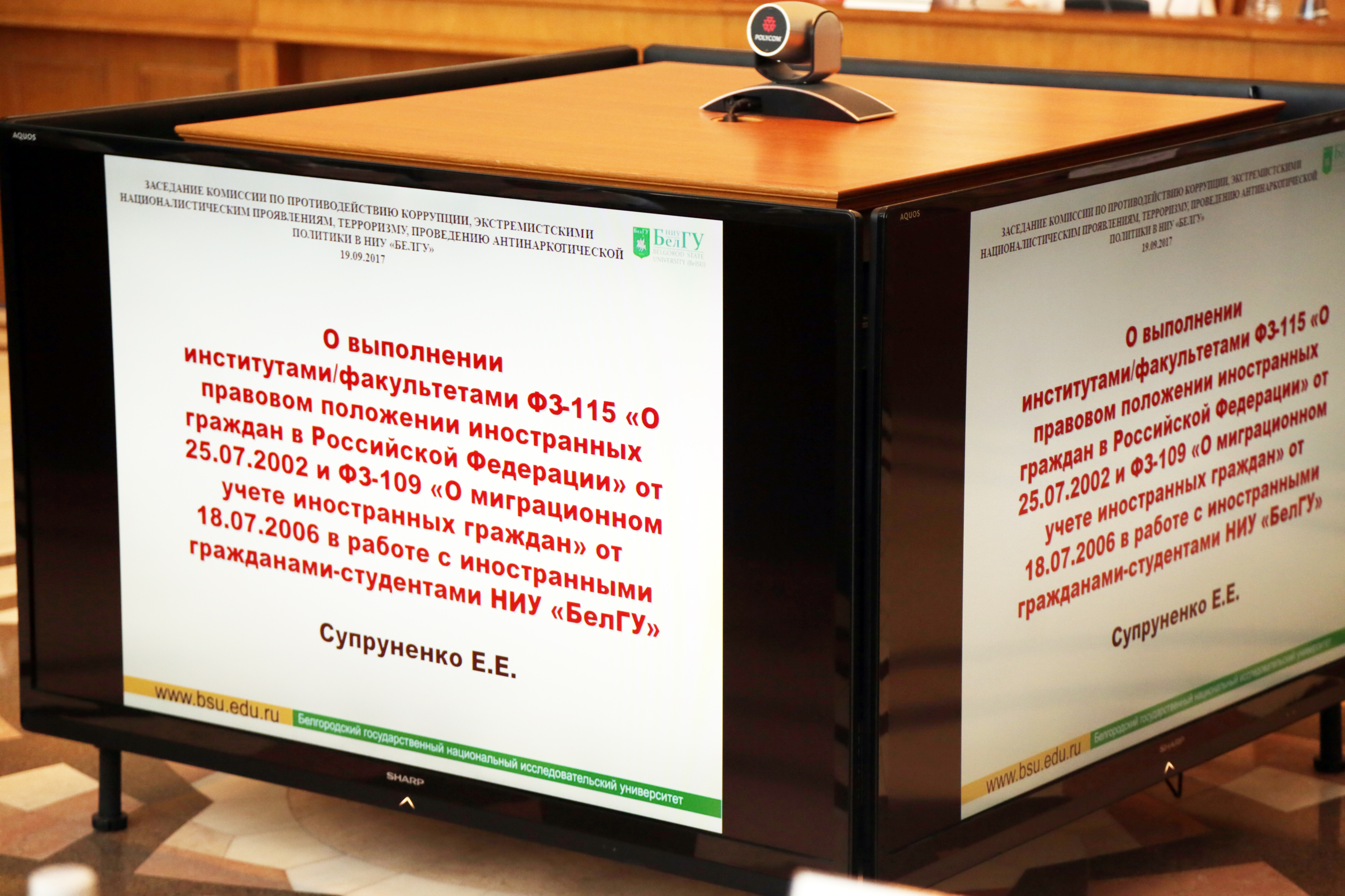 Членов комиссии приветствовал проректор по комплексной безопасности Белгородского госуниверситета Николай Голубоцких, который обозначил круг вопросов, необходимых для обсуждения. Был рассмотрен и утверждён план работы Комиссии по противодействию коррупции, экстремистским и националистическим проявлениям, терроризму, проведению антинаркотической политики в НИУ «БелГУ». О выполнении институтами и факультетами ФЗ-115 «О правовом положении иностранных граждан в Российской Федерации» и ФЗ-109 «О миграционном учёте иностранных граждан» в работе с иностранными студентами сообщила начальник отдела паспортно-визовой работы Екатерина Супруненко.