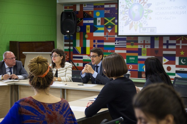 Заседание состоялось в Центре межкультурной коммуникации НИУ «БелГУ». Участниками мероприятия стали руководители Института, преподаватели и студенты ИМКиМО, выпускники различных направлений, а также учащиеся МОУ «Дубовская СОШ с УИОП». Почетным гостем заседания стал проректор НИУ «БелГУ» по международному сотрудничеству, к.ф.н., доцент Владислав Кучмистый.