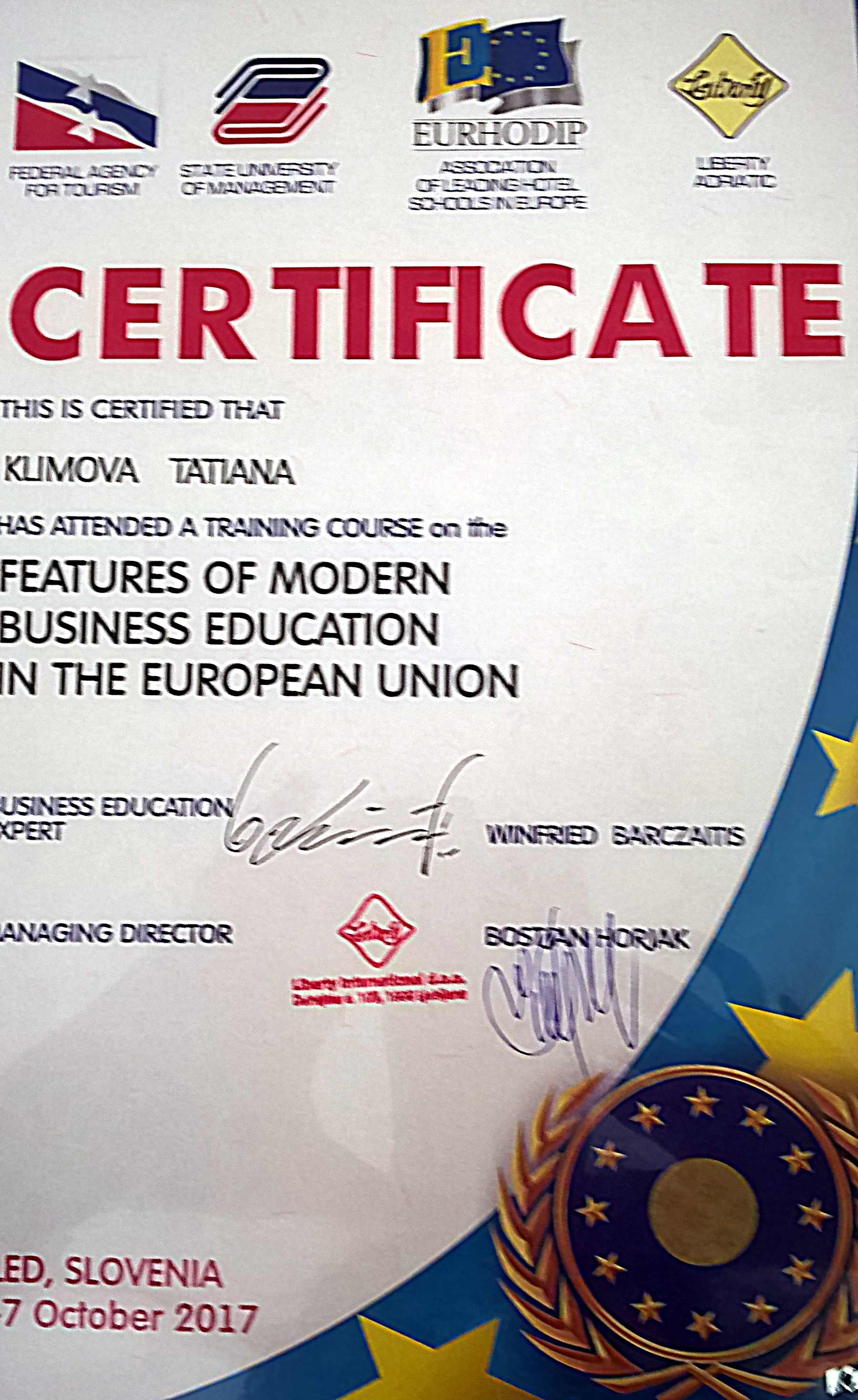 Заведующая кафедрой туризма и социально-культурного сервиса НИУ «БелГУ» Татьяна Климова была награждена правом участия в образовательном семинаре «Особенности современного бизнес-образования в странах Европейского Союза», который прошел в начале октября в Словении (г. Блед). Мероприятие было организовано Федеральным агентством по туризму при поддержке Ассоциации ведущих гостиничных школ Европы и компании LibertyAdriatic.