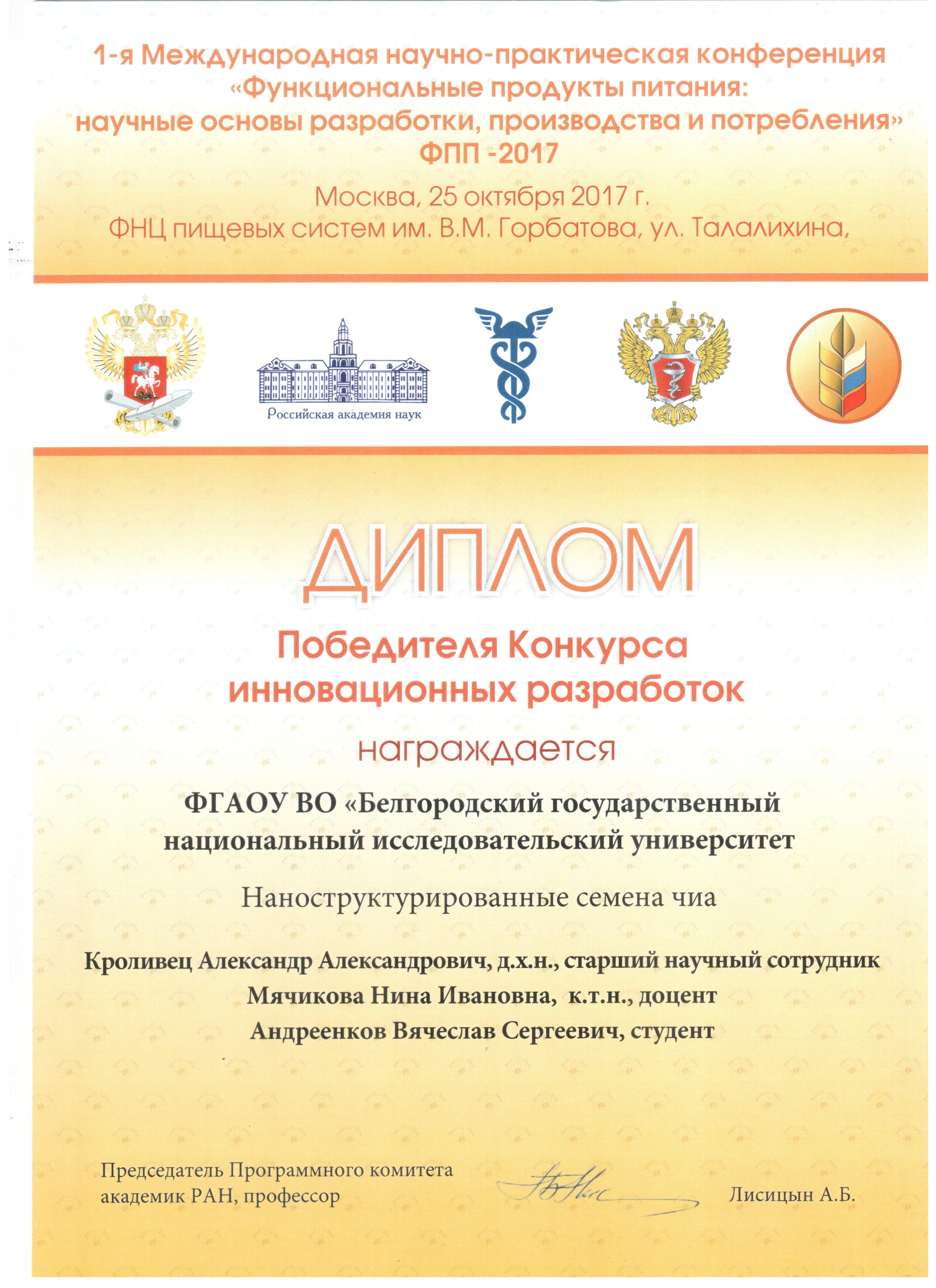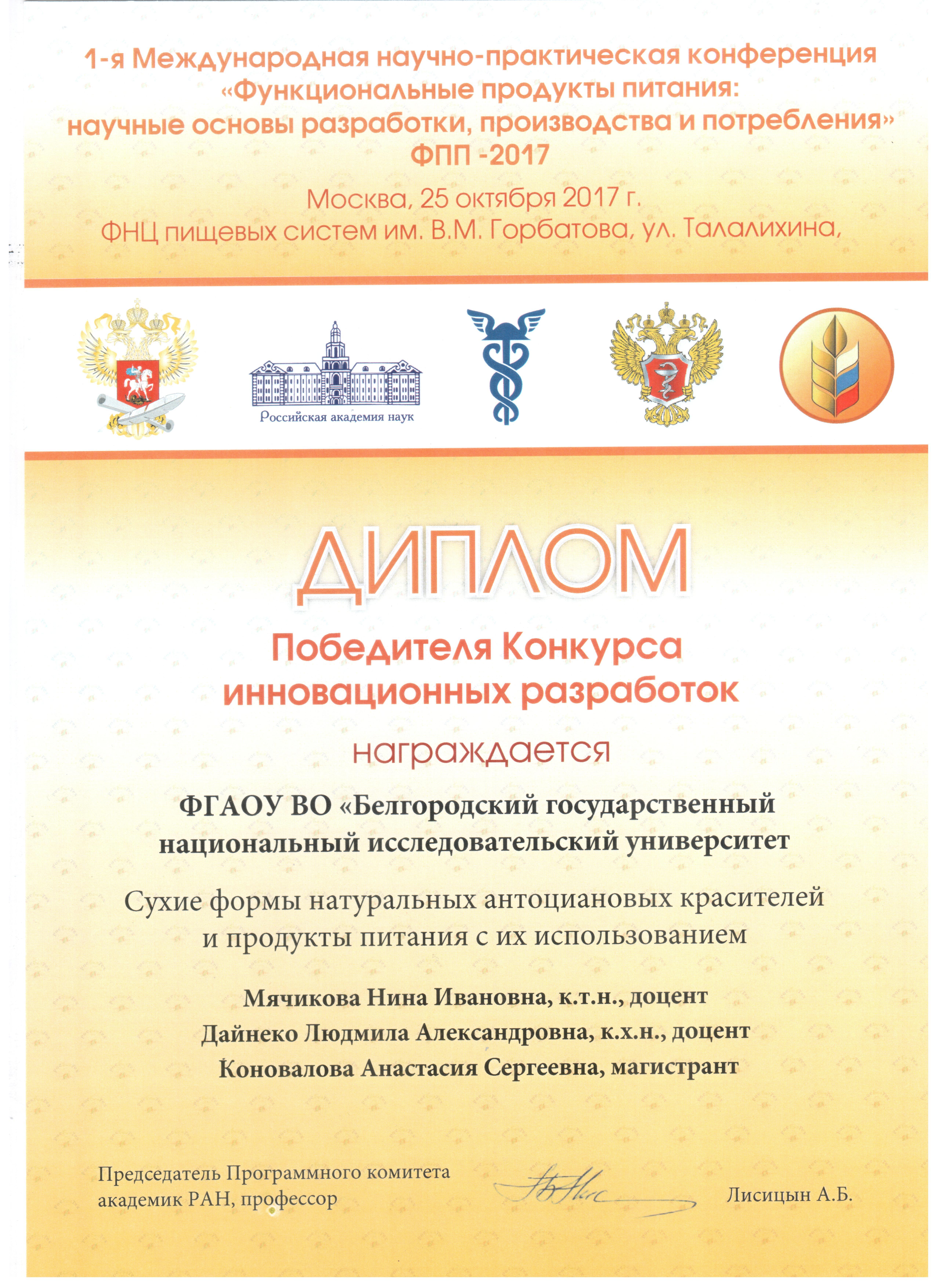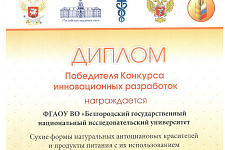 В рамках конференции проходил конкурс инновационных разработок и проектов в области функционального питания. Исследователями НИУ «БелГУ» были представлены две разработки: «Наноструктурированные семена чиа» (авторы: А.А. Кролевец, Н.И. Мячикова, В.С. Андреенков) и «Сухие формы антоциановых красителей и продукты питания с их использованием» (авторы: Н.И. Мячикова, Л.А. Дейнека, А.С. Коновалова), ставшие победителями конкурса.