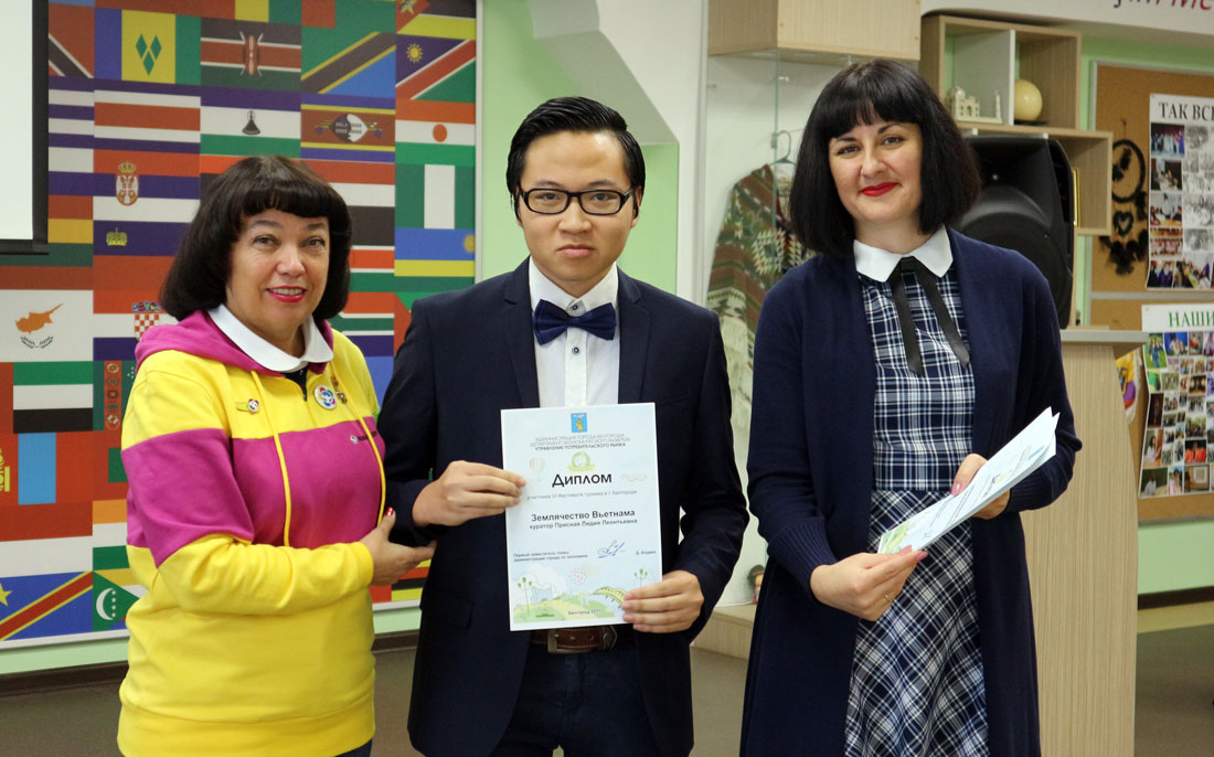 Затем Светлана Острикова и директор Центра межкультурной коммуникации НИУ «БелГУ» Елена Назаренко провели церемонию награждения дипломами администрации г. Белгорода представителей иностранных землячеств, принявших участие в VI фестивале туризма, который прошёл в областном центре.
