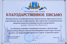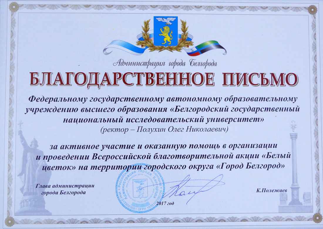НИУ «БелГУ» отмечен благодарственным письмом администрации города Белгорода за активное участие и оказанную помощь в организации и проведении Всероссийской благотворительной акции «Белый цветок»