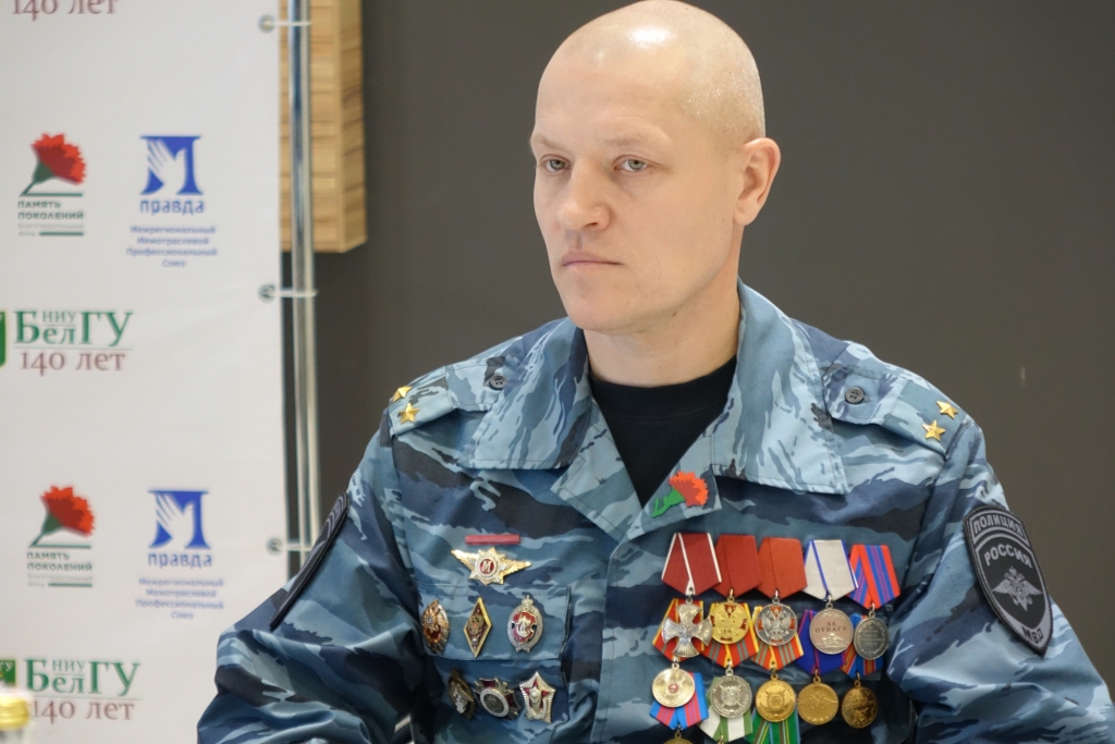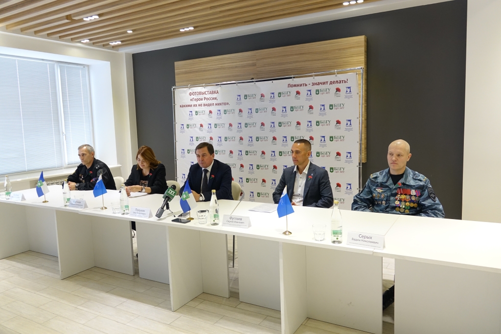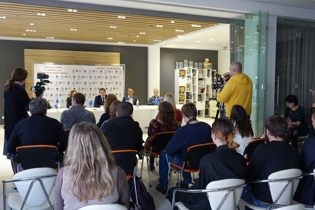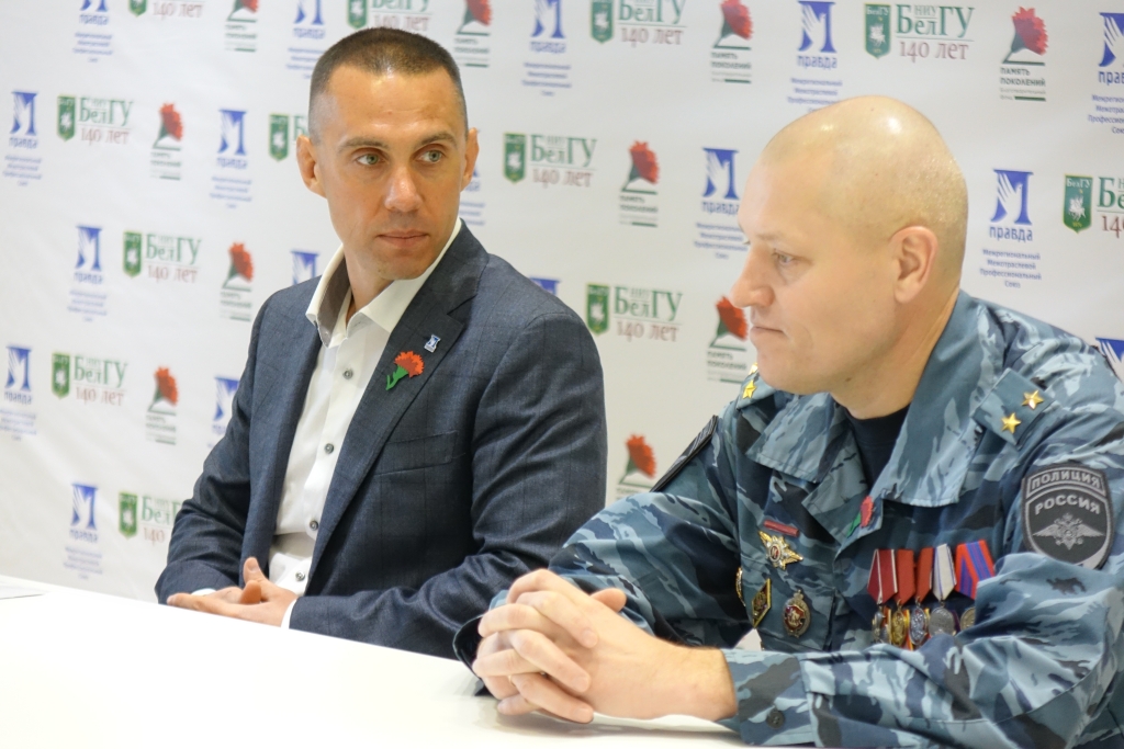Открытие фотовыставки «Герои России, какими их не видел никто» благотворительного фонда «Память поколений» предваряла пресс-конференция, в которой участвовали ректор Белгородского госуниверситета, профессор Олег Полухин, председатель Межрегионального межотраслевого профессионального союза «Правда» Сергей Фуглаев, исполнительный директор фонда «Память поколений» Екатерина Круглова и, конечно же, герои современной России, белгородцы – старший инженер-сапёр инженерно-технической группы ОМОНА, кавалер ордена Мужества Вадим Серых и кинолог, кавалер ордена Мужества, ордена «За заслуги перед Отечеством» II степени Игорь Брудков.