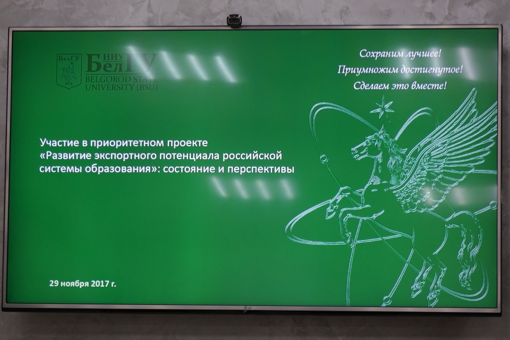 Михаил Трубицын поприветствовал участников и обозначил основную тему встречи: «Организация взаимодействия вузов Белгородской области по развитию экспортного потенциала системы высшего образования». Владислав Кучмистый в свою очередь напомнил, что НИУ «БелГУ» стал вузом-экспортёром российского образования и призвал коллег к консолидации и сотрудничеству. В своём докладе о развитии экспортного потенциала в системе высшего образования он обозначил направления экспорта образования, заданные консорциумом вузов-экспортёров и особенно подчеркнул, что эффективное повышение статуса российского образования в мире и повышение его узнаваемости как бренда невозможно без тесного сотрудничества региональных вузов.