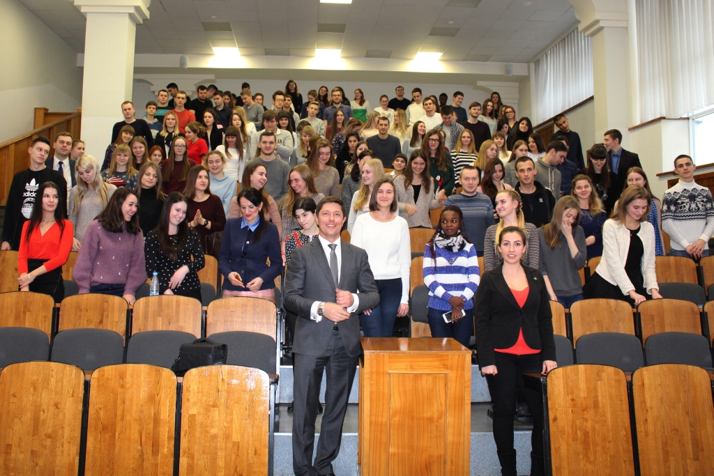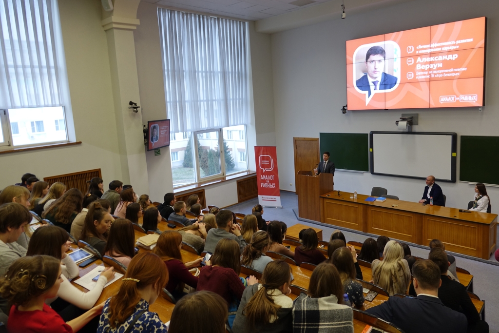 Директор по корпоративной политике и развитию ГК «Агро-Белогорье» Александр Верзун провел встречу со студентами Белгородского госуниверситета на тему: «Личная эффективность развития и планирование карьеры». На ней собрались студенты разных факультетов и институтов НИУ «БелГУ». На встрече шёл разговор на тему развития ГК «Агро-Белогорье», об успешных и новых проектах белгородского холдинга. Студенты также задали спикеру личные и профессиональные вопросы. По итогам встречи Александр Верзун подарил двум студентам книги за лучшие вопросы.
