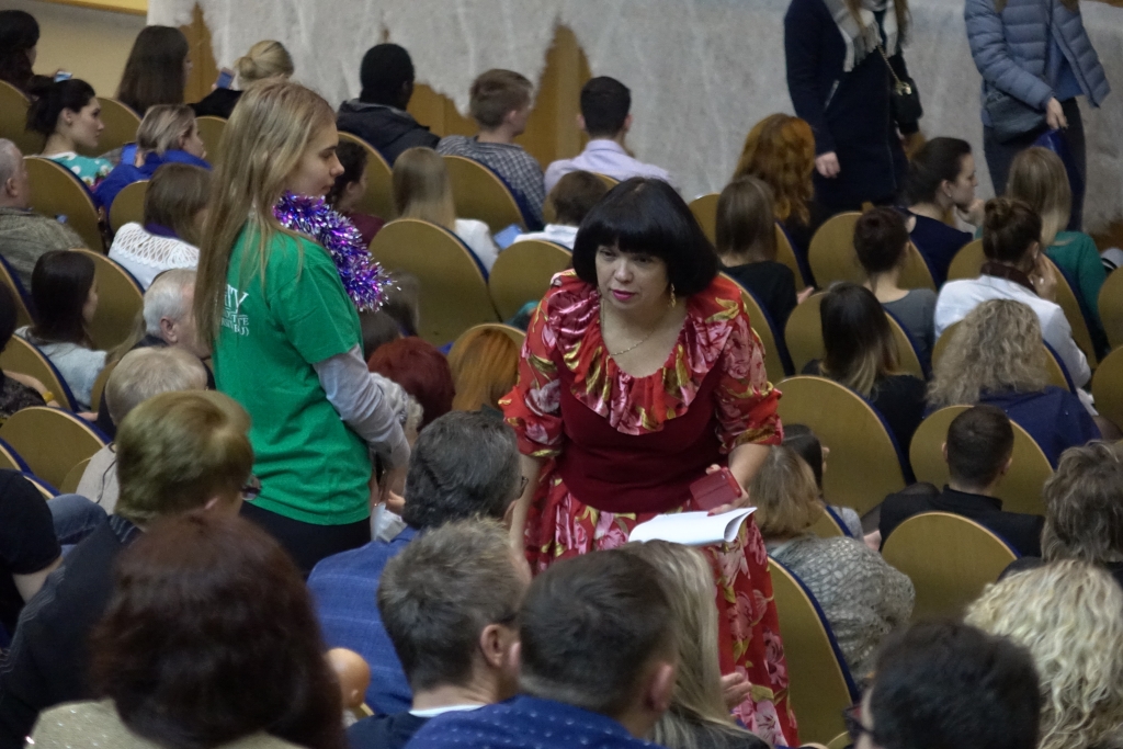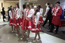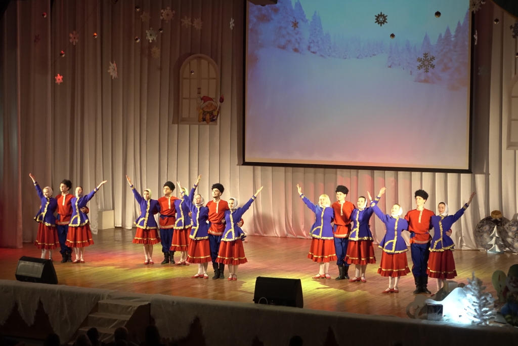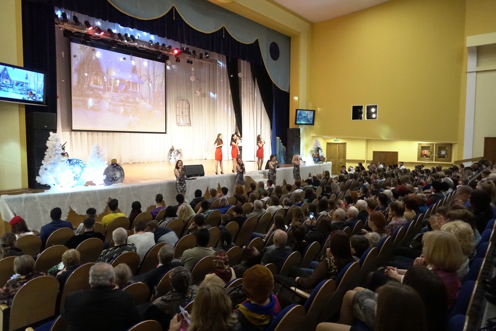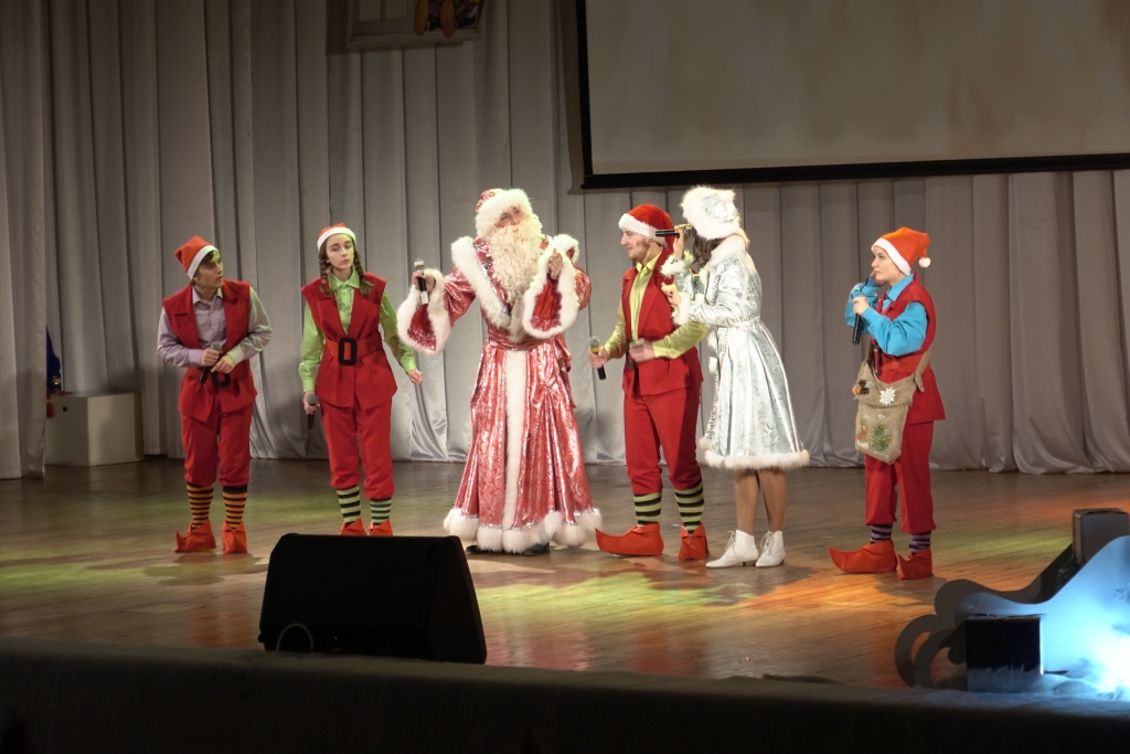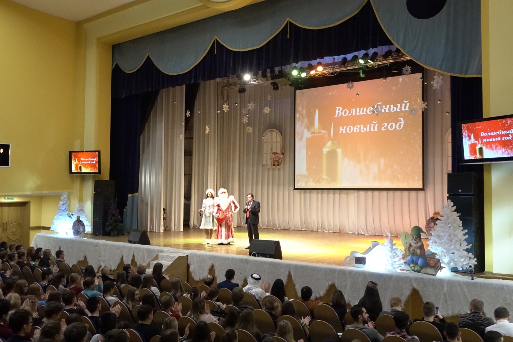 В концертном зале молодёжного культурного центра собрались студенты, представители ректората, преподаватели, сотрудники и ветераны вуза. Зрителей приветствовали Дед Мороз и Снегурочка, а также другие сказочные персонажи.
