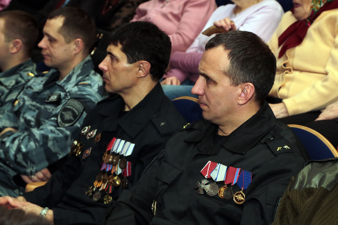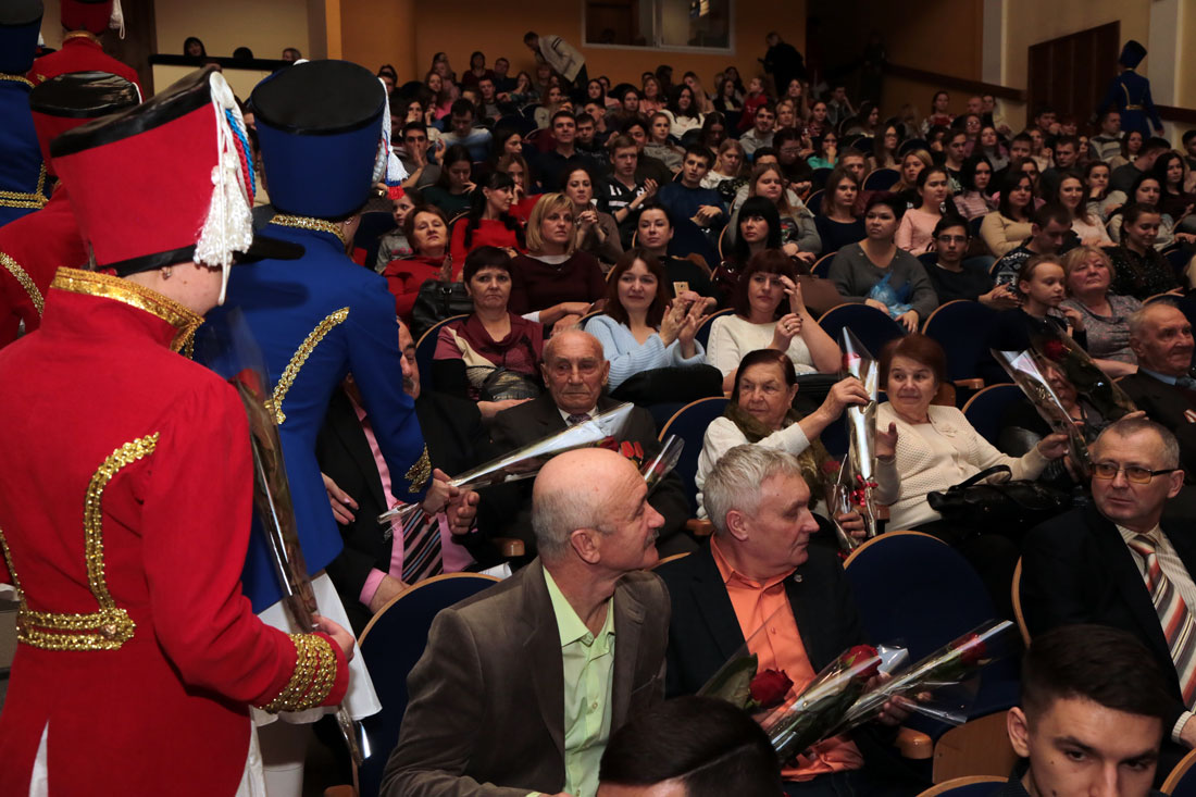 Перед началом концерта в фойе МКЦ звучали любимые многими поколениями мелодии в исполнении ректорского духового оркестра. В концертном зале собрались преподаватели, студенты, сотрудники и, конечно же, ветераны Великой Отечественной войны, участники боевых действий и ветераны Белгородского госуниверситета. Ко всем присутствующим с поздравлениями обратился ректор НИУ «БелГУ», профессор Олег Полухин, который отметил, что на долю русского народа выпало немало исторических потрясений, однако он выстоял, несмотря ни на что, благодаря воле, силе и мужеству защитников Родины. Ректор подчеркнул, что университет прививает молодому поколению чувство гордости за свою страну, ответственность за дальнейшую судьбу России.