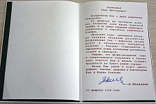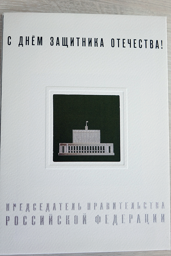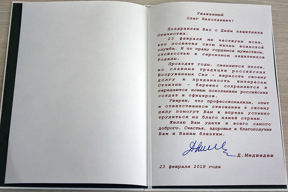 «23 февраля мы чествуем всех, кто посвятил свою жизнь воинской службе. И по праву гордимся мужеством, стойкостью и героизмом защитников Родины. Проходят, сменяются эпохи, но славные традиции российских Вооружённых Сил – верность своему долгу и преданность интересам Отчизны – бережно сохраняются новым поколением российских солдат и офицеров. Уверен, что профессионализм, опыт и ответственное отношение к своему делу помогут вам и впредь успешно трудиться на благо нашей страны».