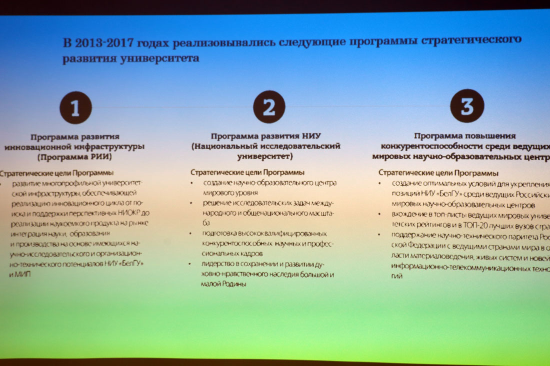 Ректор вуза Олег Полухин ознакомил участников заседания с результатами развития НИУ «БелГУ» в 2013-2017 гг. В ходе презентации было обращено внимание на интегральные показатели, сконцентрированные в трёх стратегических программах НИУ «БелГУ» и позволившие университету занять уверенные позиции в международных и национальных рейтингах высших учебных заведений.