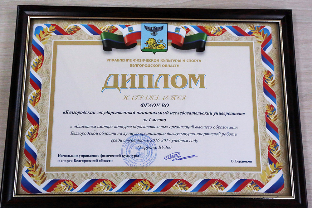 Белгородский государственный университет награждён дипломом за I место в смотре-конкурсе образовательных организаций высшего образования Белгородской области на лучшую организацию физкультурно-оздоровительной работы среди студентов в 2016-2017 учебном году. Диплом и кубок вручил проректору по культурно-воспитательной деятельности Светлане Остриковой начальник управления физической культуры и спорта Белгородской области Олег Сердюков.