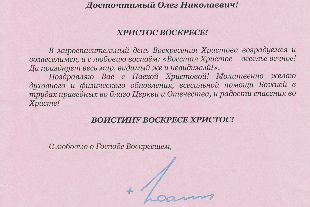 В адрес ректора Белгородского государственного национального исследовательского университета Олега Полухина пришло поздравительное письмо от митрополита Белгородского и Староскольского Иоанна. Владыка Иоанн отметил, что в день Воскресения Христова весь мир радуется и наполняется любовью.
