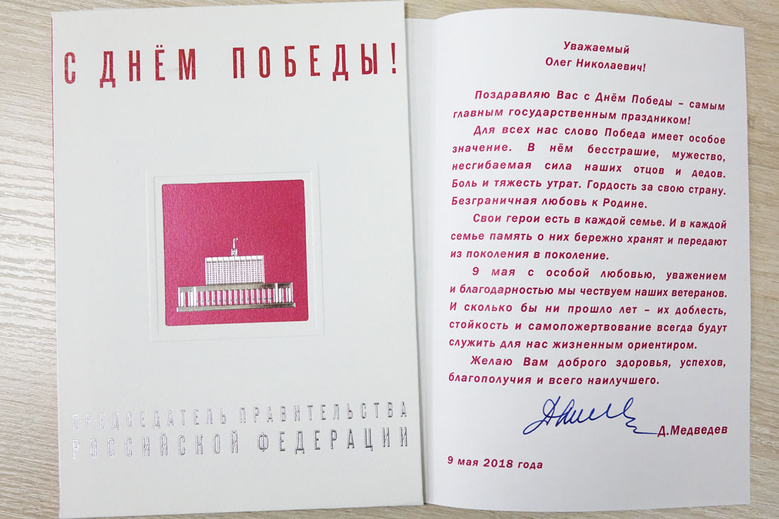 В адрес ректора Белгородского национального исследовательского университета, профессора Олега Полухина пришло поздравительное письмо от председателя правительства РФ Дмитрия Медведева. В поздравлении Дмитрий Анатольевич отметил, что для всех россиян слово Победа имеет особое значение, ведь в нём «и бесстрашие, и мужество, и несгибаемая сила наших предков, и боль утрат, и гордость за страну, и безграничная любовь к Родине».