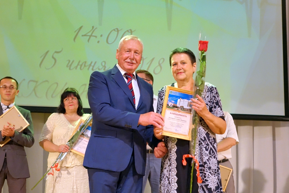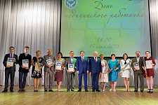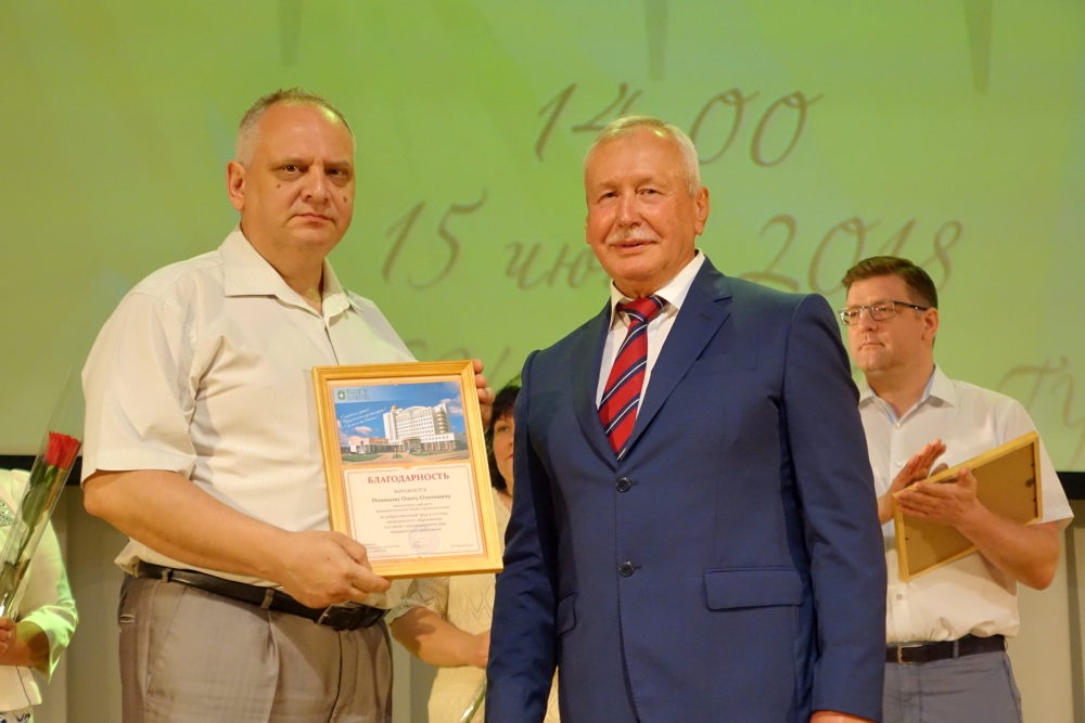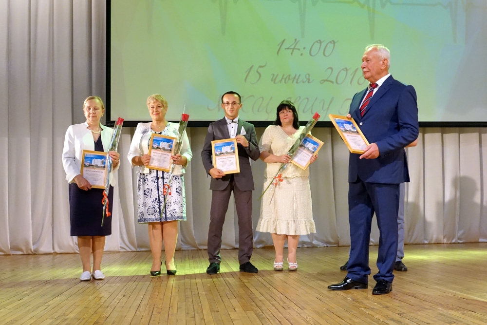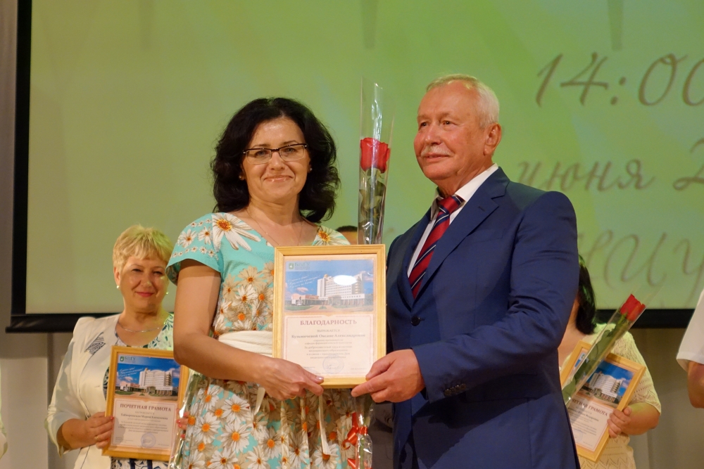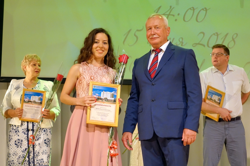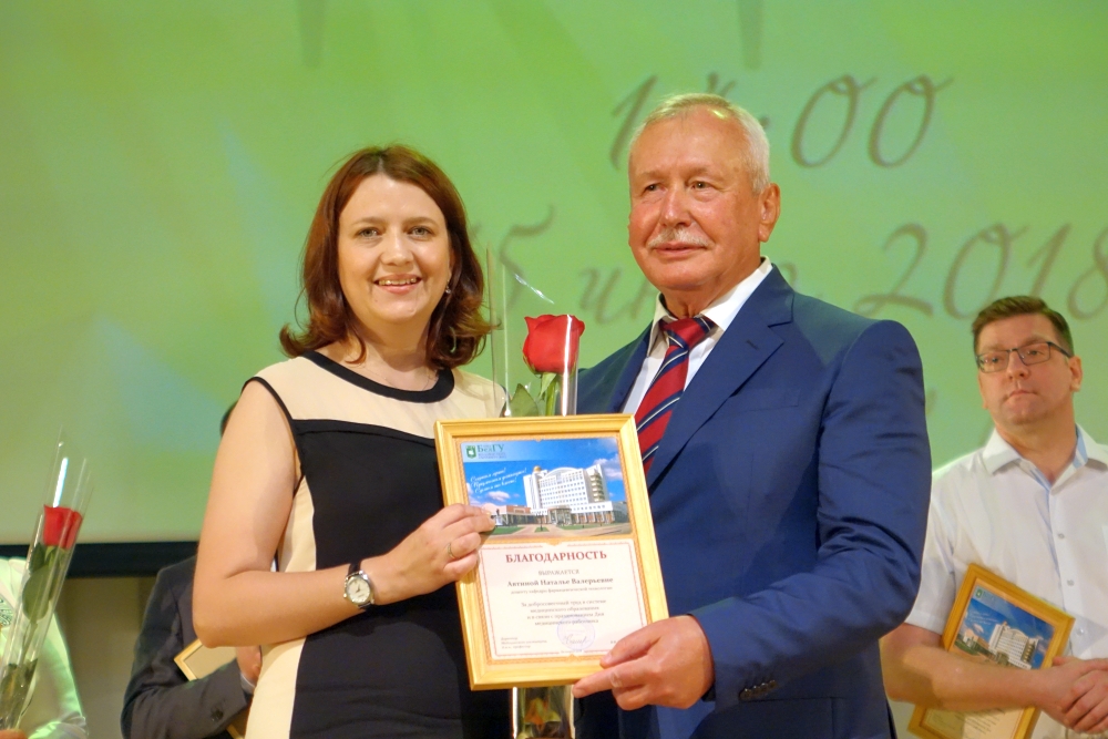 Ректор Белгородского госуниверситета Олег Полухин и директор Медицинского института НИУ «БелГУ» Владимир Куликовский вручили почётную грамоту департамента здравоохранения и социальной защиты населения Белгородской области старшей медицинской сестре отделения общей врачебной практики Поликлиники НИУ «БелГУ» Ольге Нарожней. Благодарственные письма департамента здравоохранения и социальной защиты населения Белгородской области были вручены: главному врачу поликлиники НИУ «БелГУ» Оксане Белоусовой, врачу общей практики отделения общей врачебной практики Поликлиники НИУ «БелГУ» Елене Кузнецовой, медицинской сестре отделения общей врачебной практики Поликлиники НИУ «БелГУ» Светлане Помазковой. Благодарностями НИУ «БелГУ» были награждены: первый заместитель директора института Николай Белоусов, заместитель директора медицинского института по проектной и международной деятельности, руководитель направления «Стоматология» Александр Цимбалистов, заместитель директора медицинского института по научной работе, руководитель направления «Лечебное дело и педиатрия» Нина Жернакова, декан факультета медико-профилактического дела Владимир Феттер, заведующий кафедрой фармацевтической технологии Елена Жилякова. Благодарностями и почётными грамотами университета и института были награждены студенты и преподаватели. Директор медицинского колледжа Медицинского института Евгений Крикун поздравил коллег с профессиональным праздником и прочёл стихотворение.
