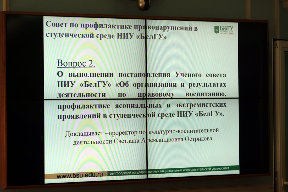 Основной темой заседания, которое проходило под председательством проректора по культурно-воспитательной деятельности НИУ «БелГУ» Светланы Остриковой, стало выполнение постановления учёного совета – «об организации и результатах деятельности по правовому воспитанию, профилактике асоциальных и экстремистских проявлений в студенческой среде НИУ «БелГУ». По решению учёного совета поставлена задача до конца сентября 2018 года разработать комплексную программу по «Правовому воспитанию студентов НИУ «БелГУ».