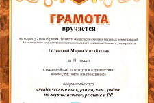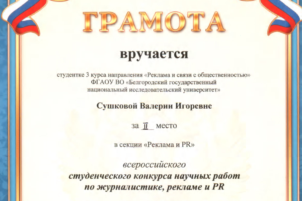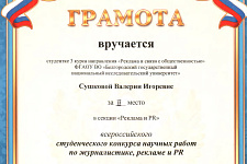 II место в номинации «Студенты» того же направления заняла студентка 3 курса направления подготовки «Реклама и связи с общественностью» Валерия Сушкова с работой «Особенности нативной рекламы: понятие, специфика, виды» (научный руководитель - старший преподаватель кафедры коммуникативистики, рекламы и связей с общественностью Анна Белоедова).
