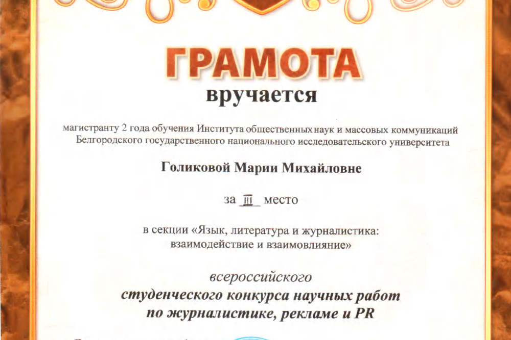 В номинации «Магистранты» секции «Язык, литература и журналистика: взаимодействие и взаимовлияние» III место заняла магистрантка второго года обучения по направлению подготовки «Медиакоммуникации» Мария Голикова, представив доклад «Лексические доминанты студенческих медиатекстов (на материале сообществ в социальной сети «ВКонтакте»)» (научный руководитель – заведующий кафедрой коммуникативистики, рекламы и связей с общественностью Евгений Кожемякин).
